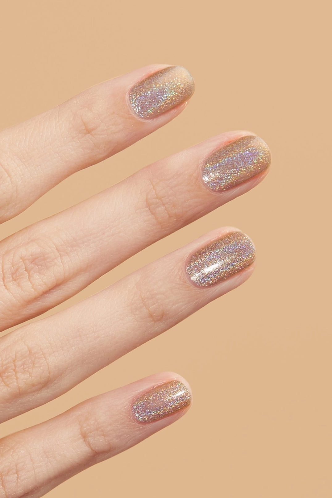 Space Cowboy is a light beige linear holographic nail polish. This polish is packed with pure holographic pigments that give it a blinding prismatic finish.