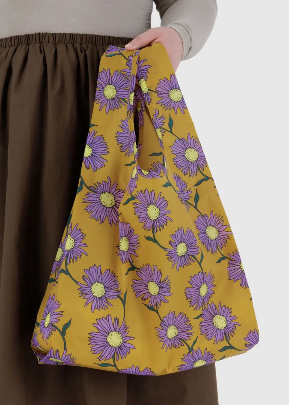 Baggu is an American brand known for its affordable, sustainable bags made from recycled materials. Inspired by the design of a plastic shopping bag, its signature product—the Standard Baggu—is made from ripstop nylon and holds 2–3 times more than a disposable bag. Committed to reducing waste and eliminating single-use plastics, Baggu designs practical, everyday styles using minimal materials to lower costs and fabric waste.