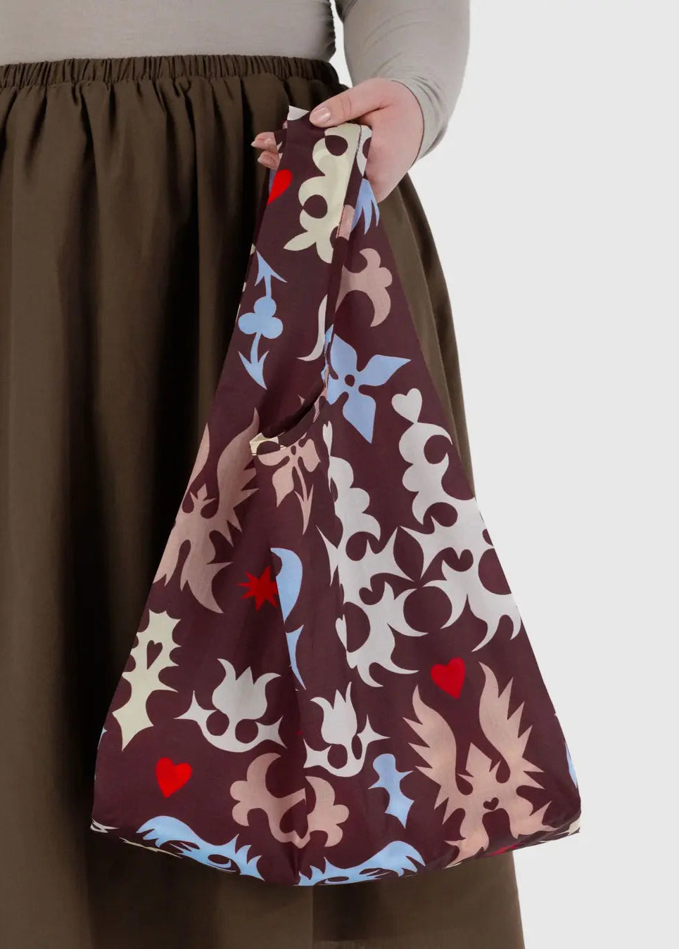 Baggu is an American brand known for its affordable, sustainable bags made from recycled materials. Inspired by the design of a plastic shopping bag, its signature product—the Standard Baggu—is made from ripstop nylon and holds 2–3 times more than a disposable bag. Committed to reducing waste and eliminating single-use plastics, Baggu designs practical, everyday styles using minimal materials to lower costs and fabric waste.