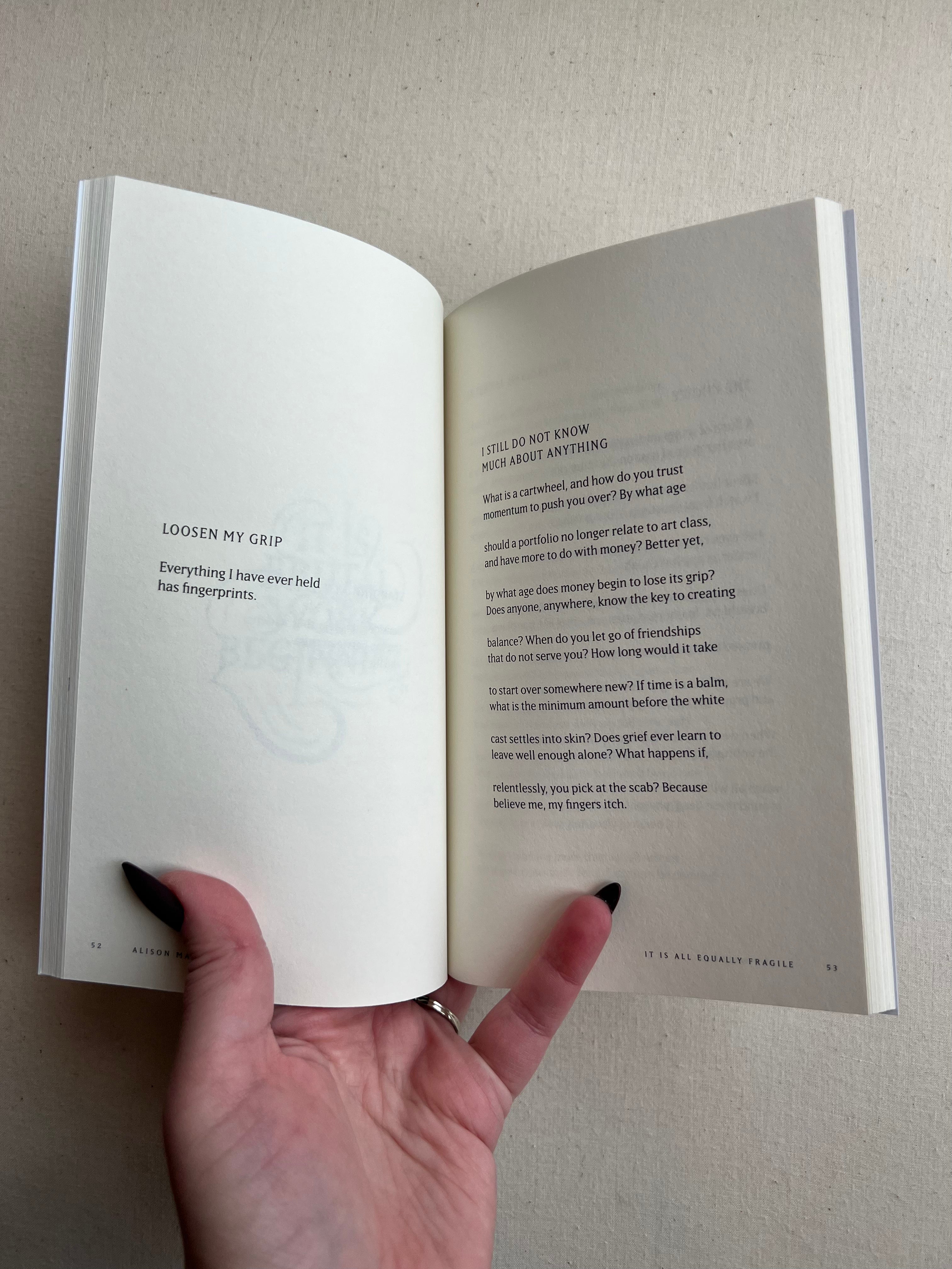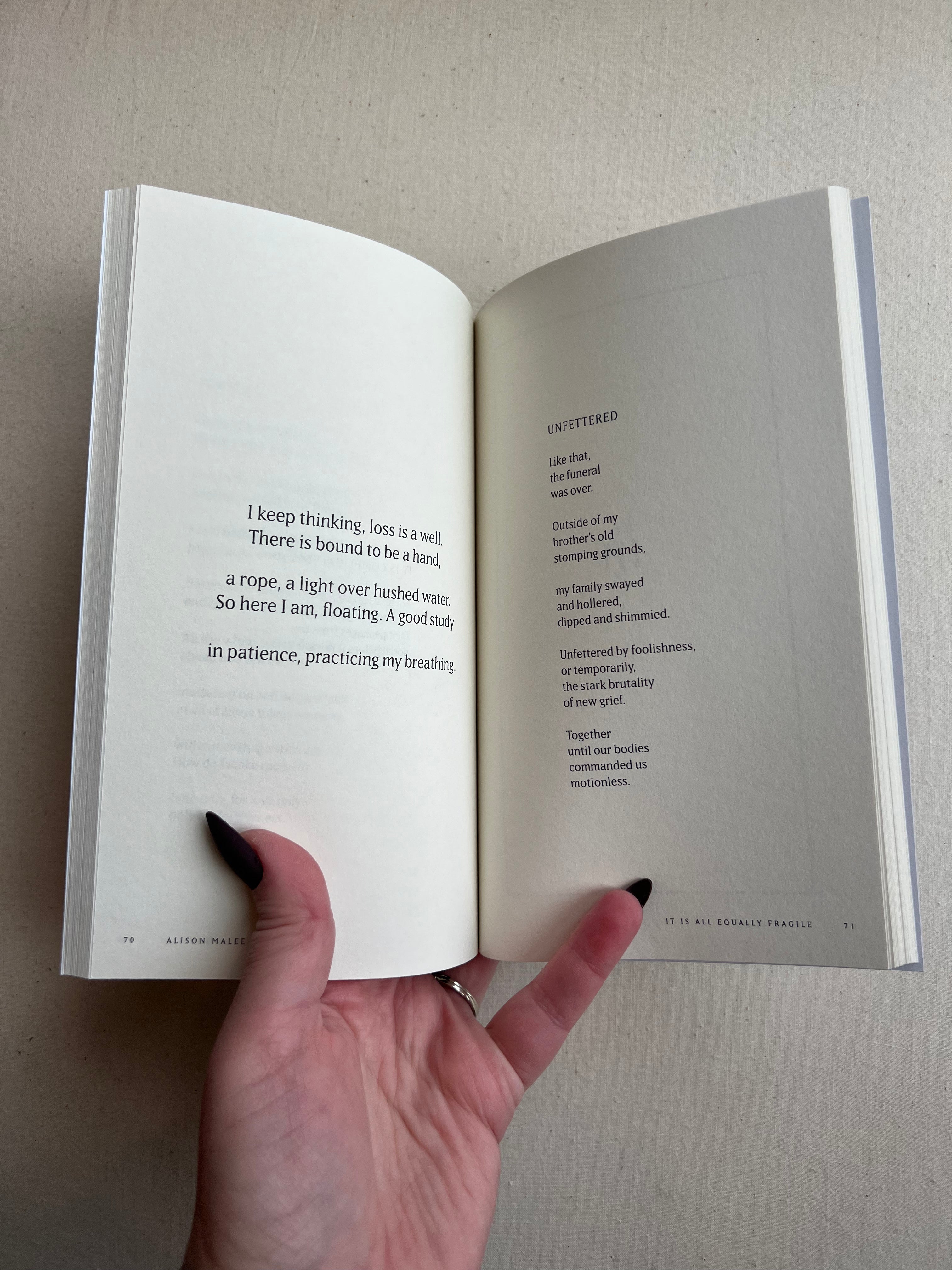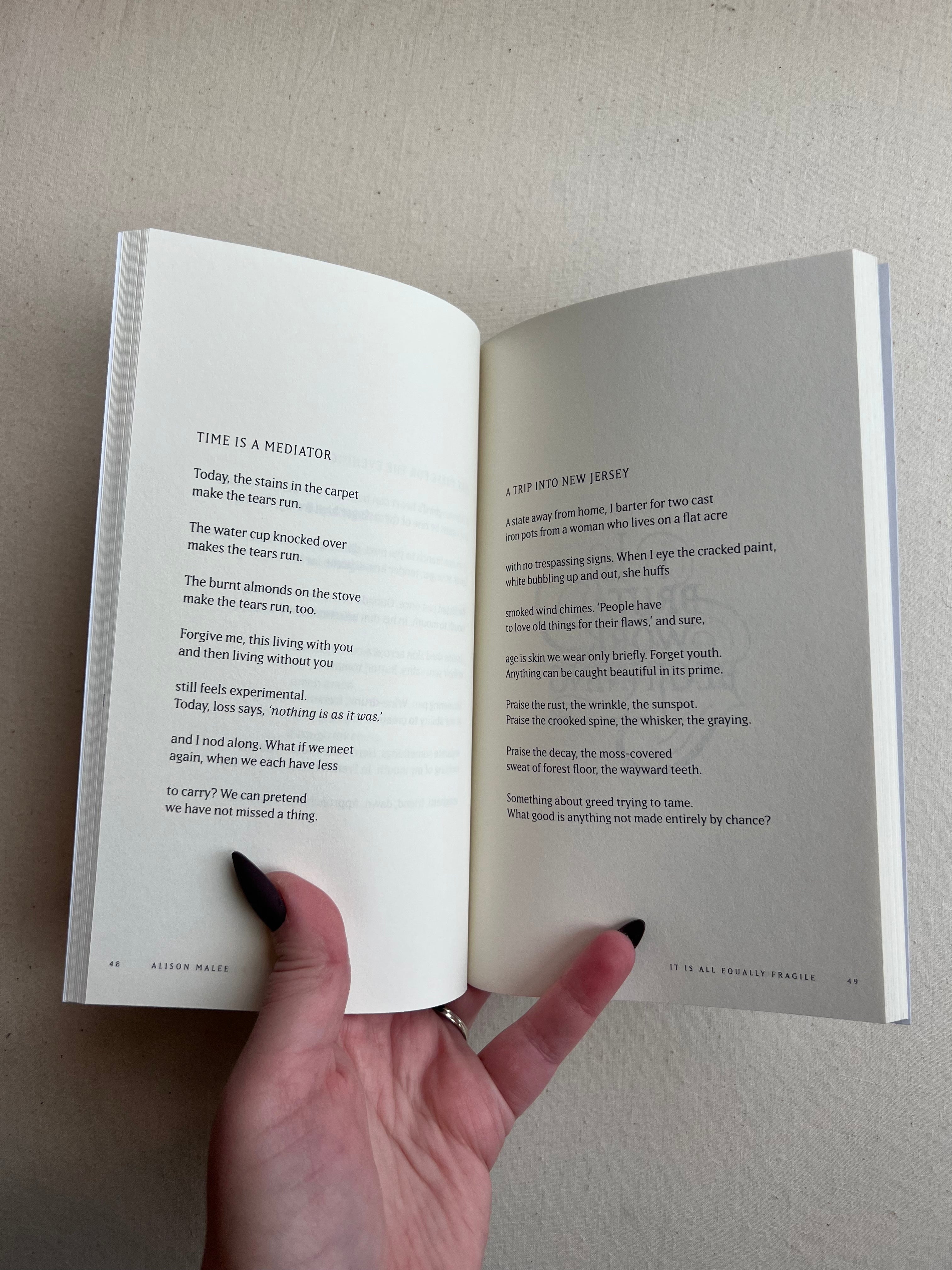 This book is a peek into the fragility of our everyday moments. A delve into the hope that can bloom or wither depending on how it is held. A wide tooth comb through the muss of our intimate realities as women, lovers, friends, and mothers.