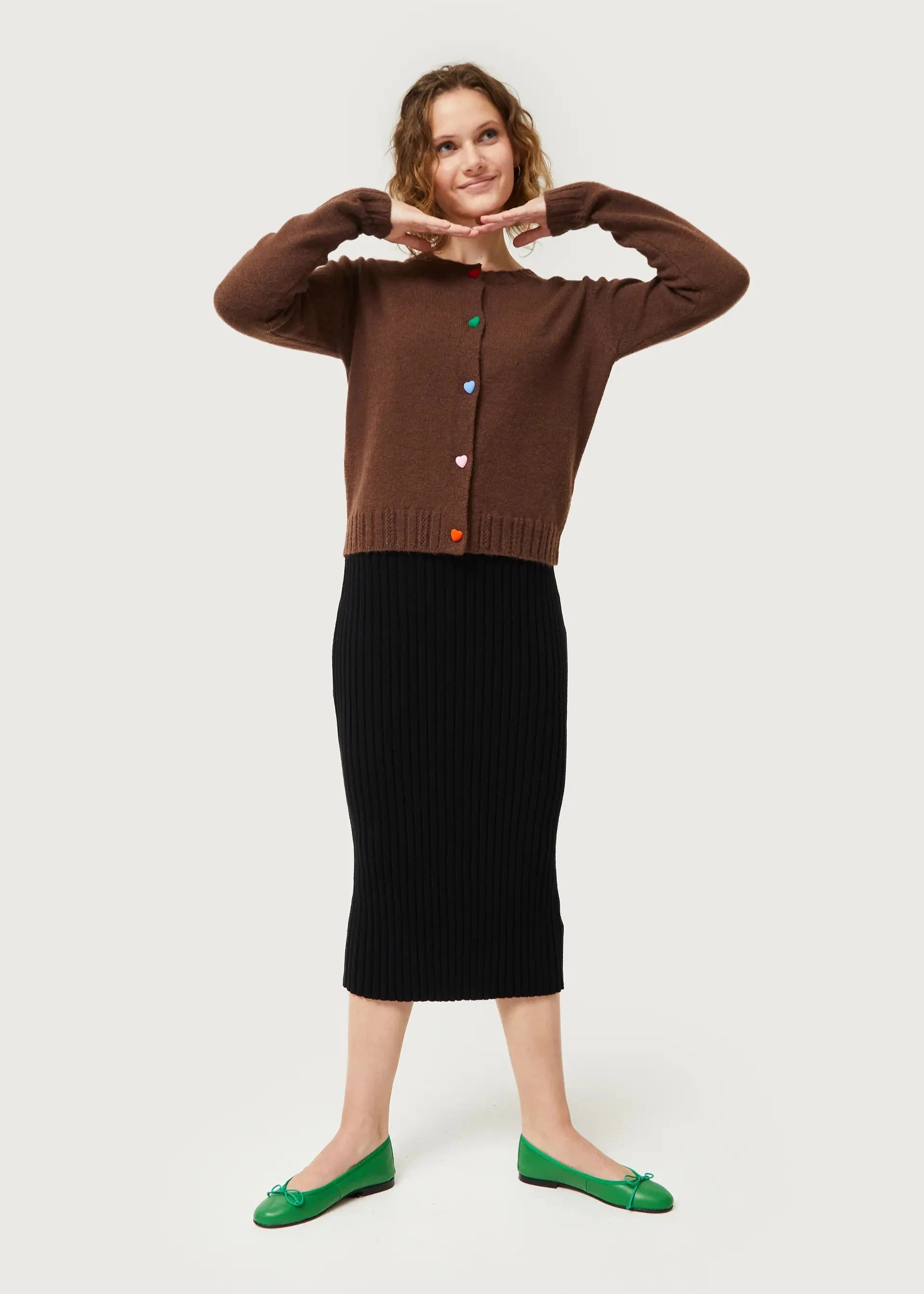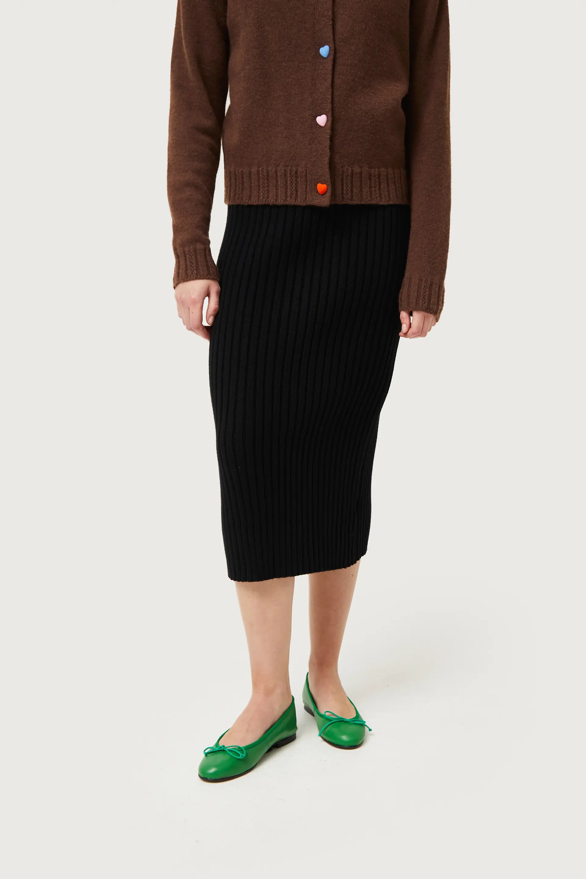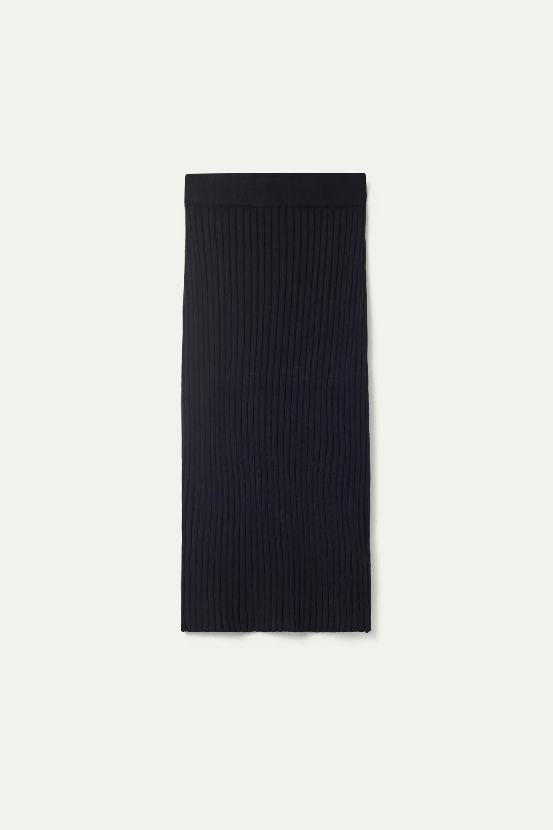 Crafted with a ribbed knit fabric, this black midi skirt boasts an elasticated waist and mid rise for comfortable wear. The back showcases a slit detail for added style.