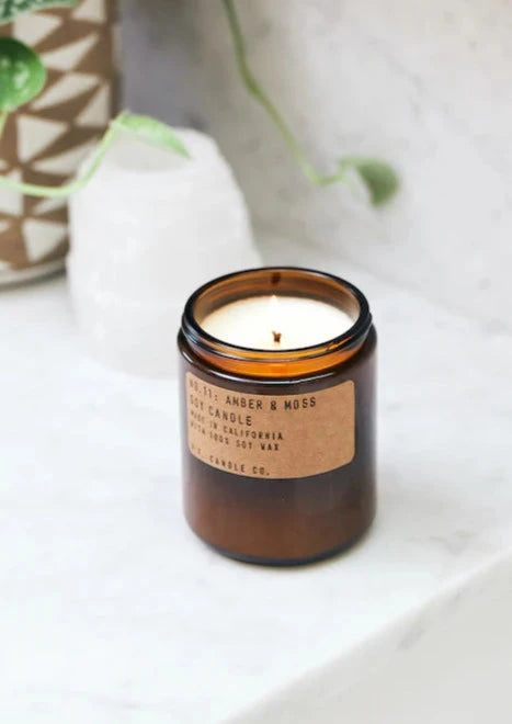 This Standard Candle is hand-poured into apothecary inspired amber jars with a signature kraft label and a brass lid. This size is meant for dressers, countertops, nightstands – basically everywhere. Scent of a weekend in the mountains, sun gleaming through the canopy. Scent of sage, moss, and lavender candle.