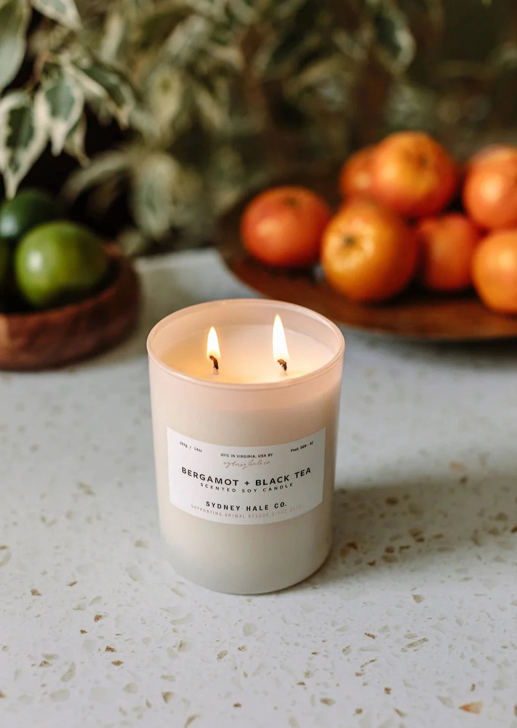 A handmade premium soy wax blend candle with a double cotton wick in a glass jar. The salty citrus of the winter blooming bergamot orange blend and come alive with the soothing aroma of dried black tea leaves.
