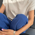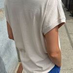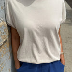The Ease Tee is an edgy dolman tee. It features a high crew neck, shoulder coverage without a sleeve, slightly rounded hem and a contrast rib banded sleeve opening and neck opening. Enough length to tuck in or out. It's a cool girl's uniform. Super soft, dropped shoulder dolman tee with a relaxed fit.