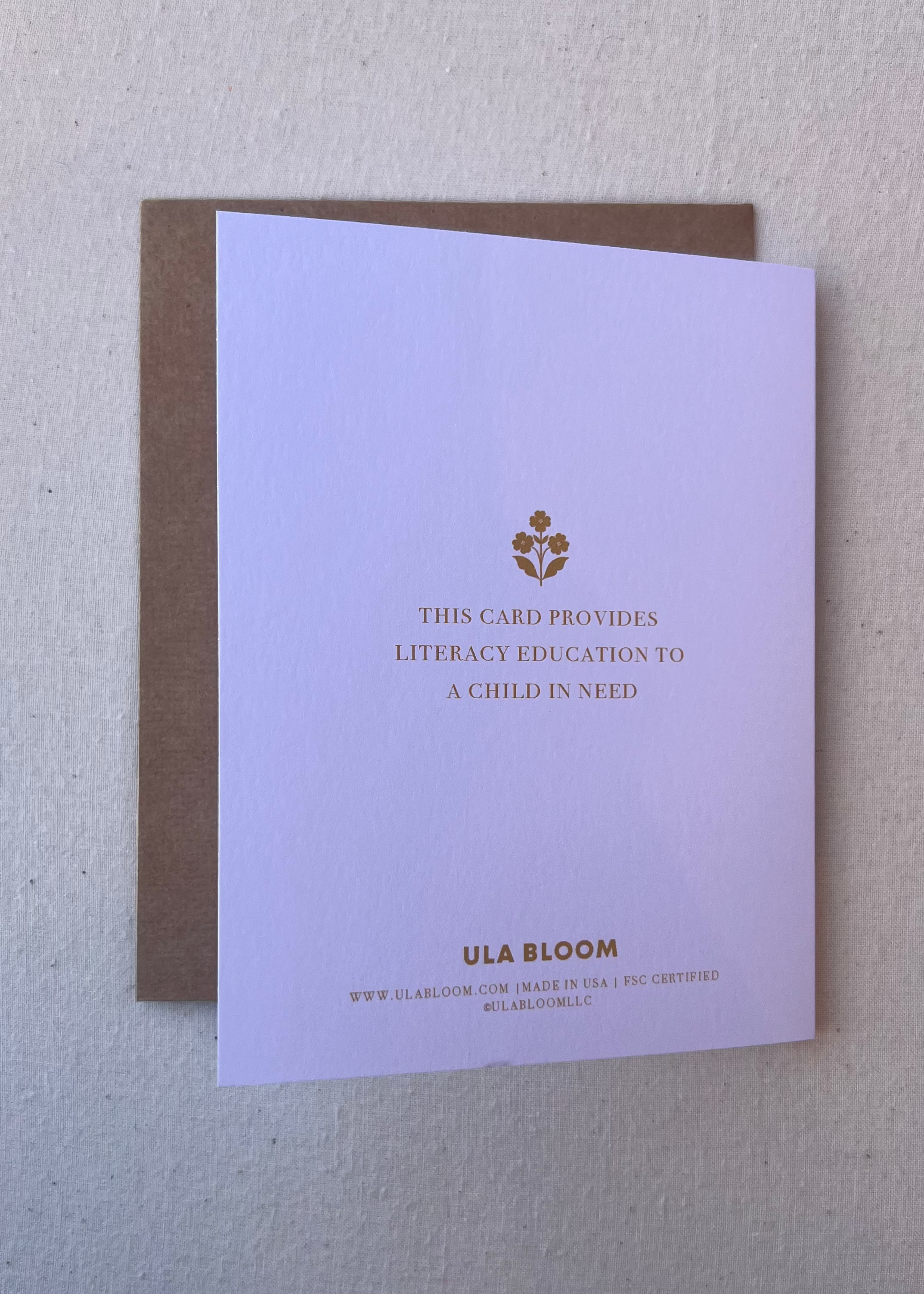 This card provides 1 day of literacy education to a child in need, helping them to dream, grow, and bloom into their full potential. All donations are made through the non-profit organization Room to Read.