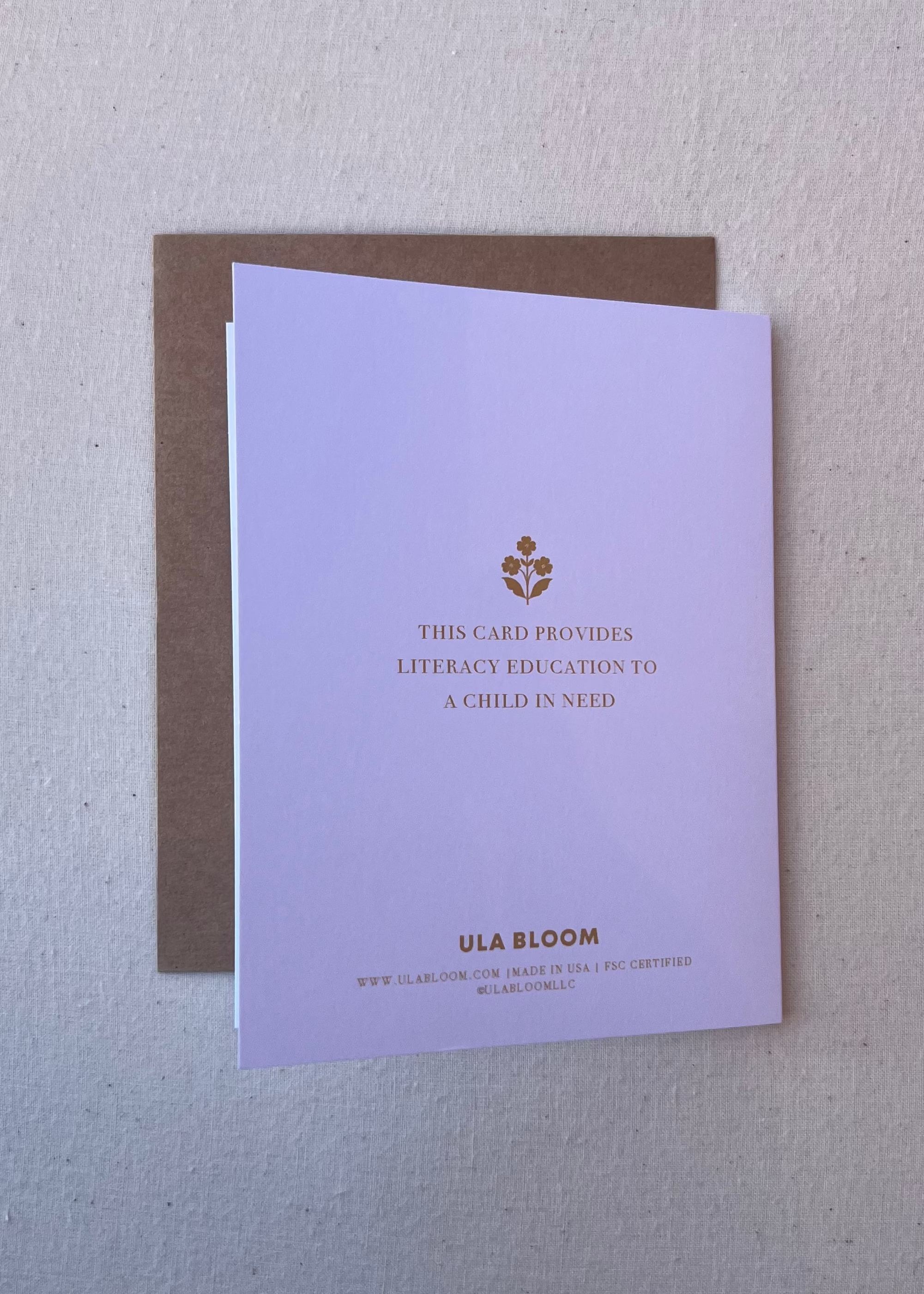 This card provides 1 day of literacy education to a child in need, helping them to dream, grow, and bloom into their full potential. All donations are made through the non-profit organization Room to Read.