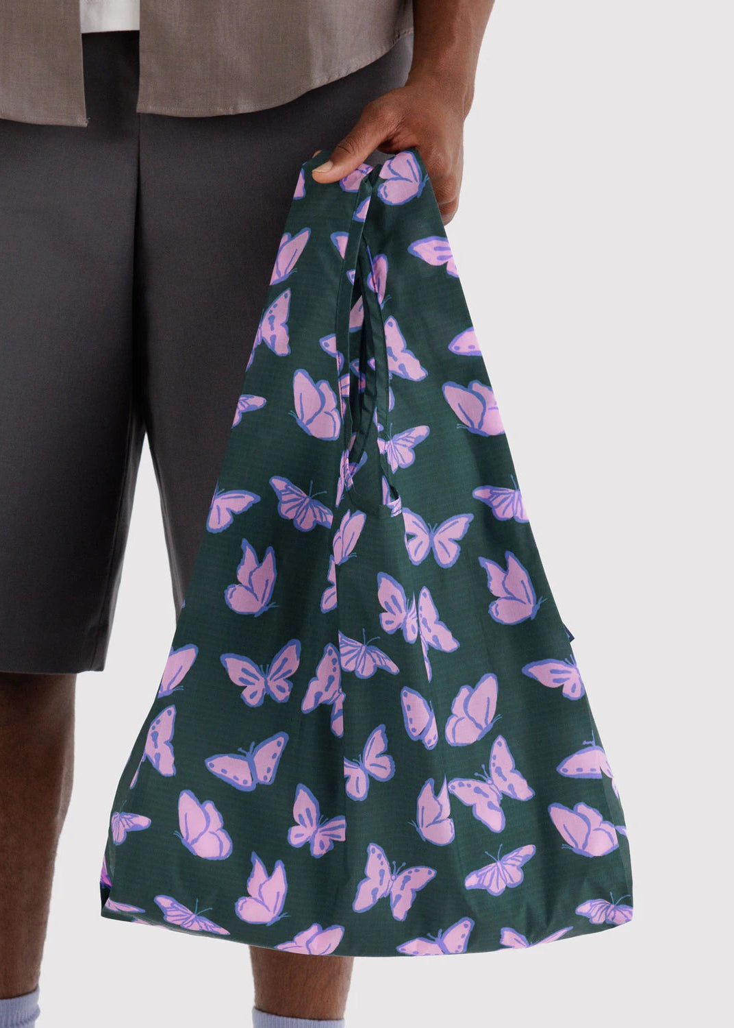 Baggu is an American brand known for its affordable, sustainable bags made from recycled materials. Inspired by the design of a plastic shopping bag, its signature product—the Standard Baggu—is made from ripstop nylon and holds 2–3 times more than a disposable bag. Committed to reducing waste and eliminating single-use plastics, Baggu designs practical, everyday styles using minimal materials to lower costs and fabric waste.