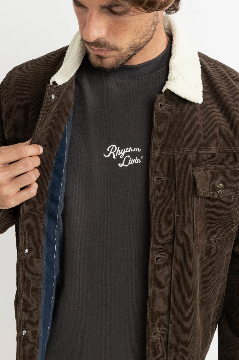 Built for warmth and durability, the Flannel Lined Cord Trucker in Chocolate is crafted with a soft corduroy shell and a cozy blanket lining. A sherpa collar adds extra warmth, while metal shank closures, welt hand pockets, and internal storage pockets bring utility to this rugged yet refined layer.