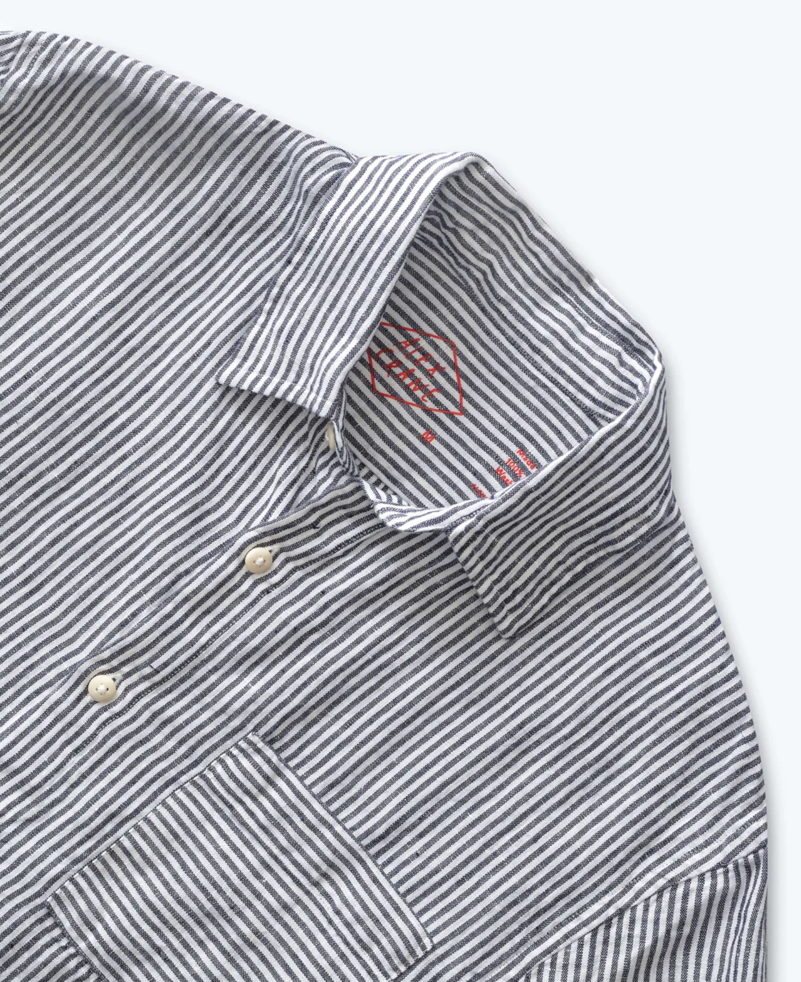 A relaxed linen short-sleeve button-up in a faded yarn-dye stripe — natural variation gives it a soft, lived-in texture. Clean, soft white, easy open collar, corozo buttons. Spun from Normandy flax, the finest in the world.