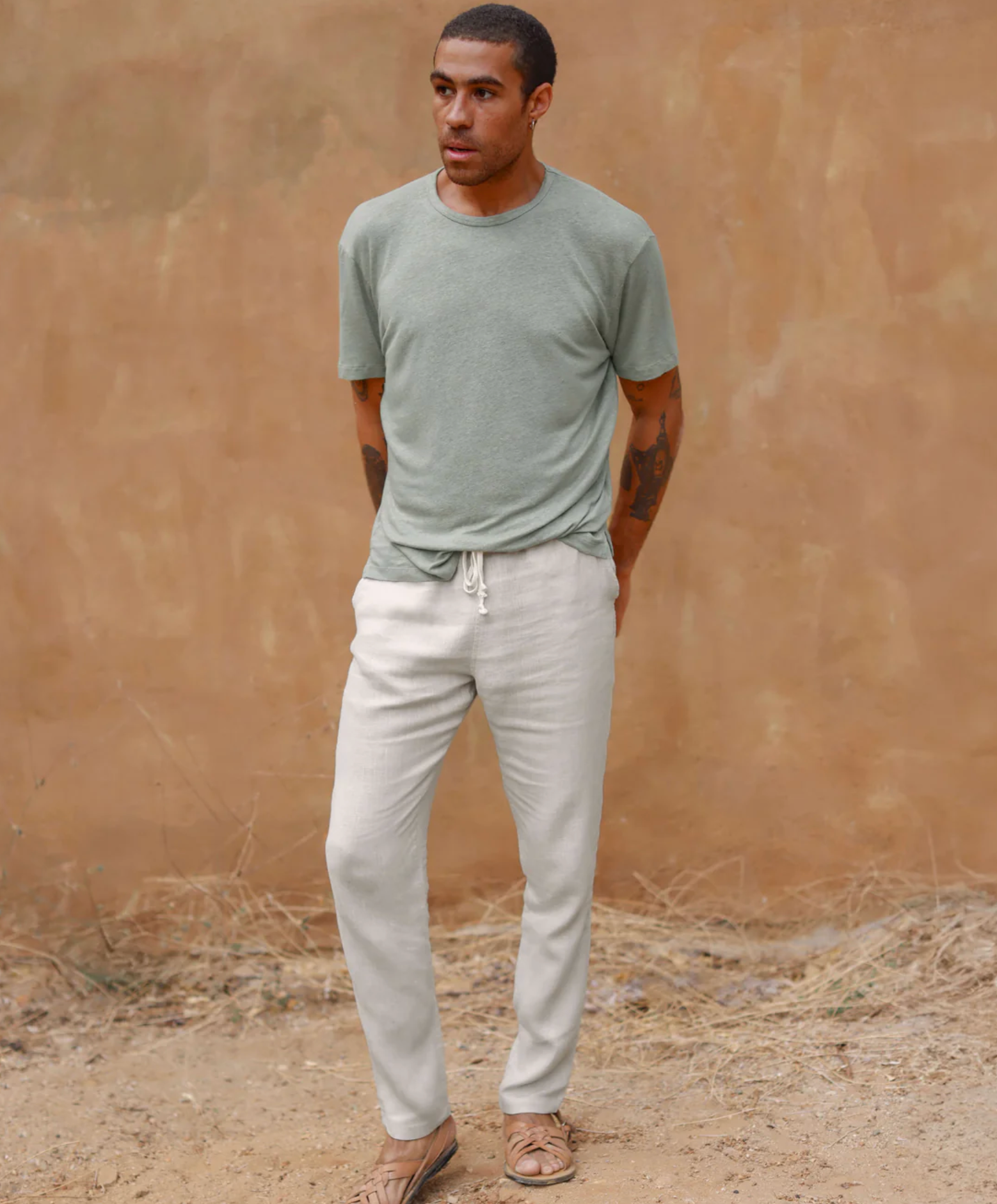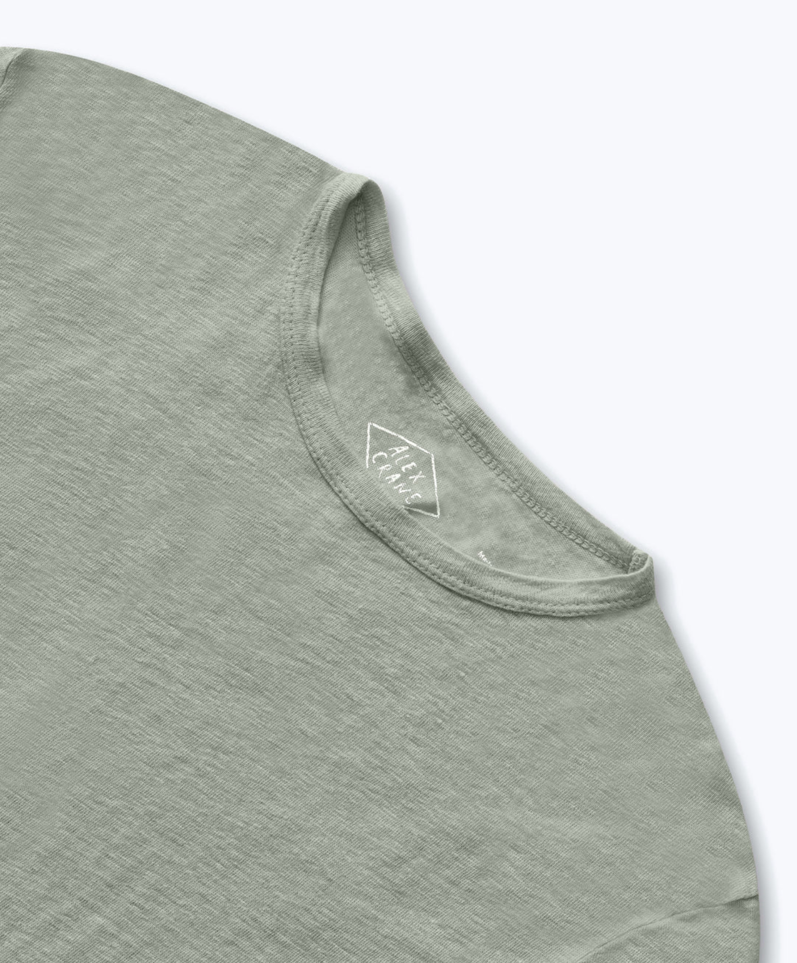 An army green linen t-shirt made with sustainably-grown French linen, knit in Portugal and washed with biodegradable softeners.