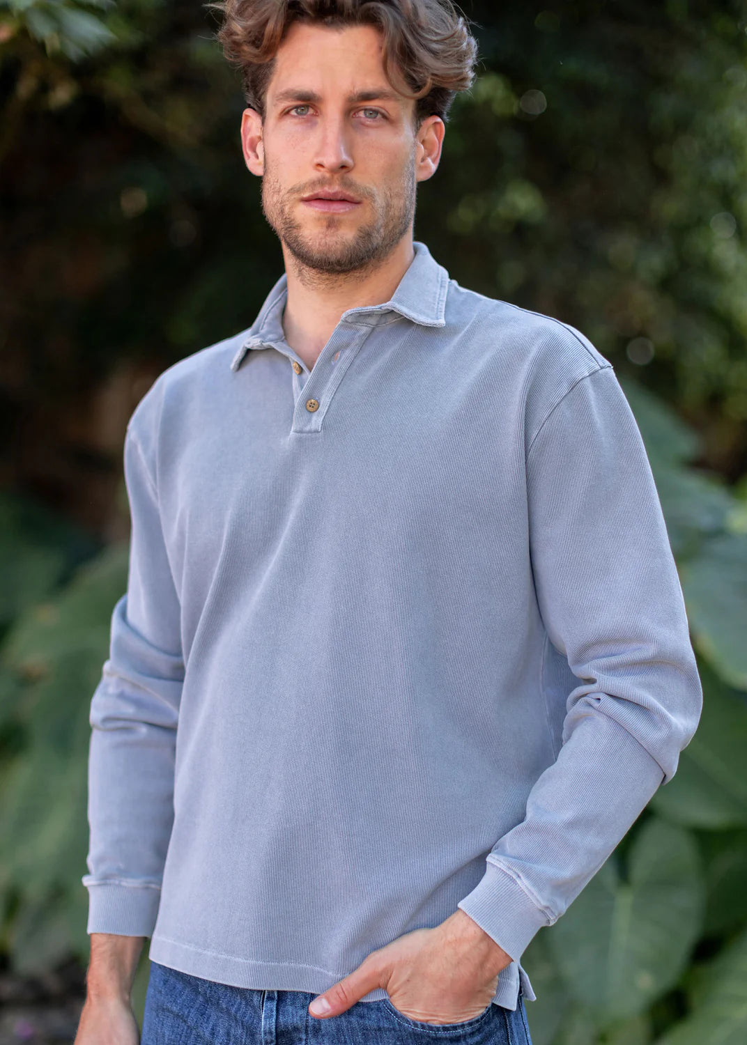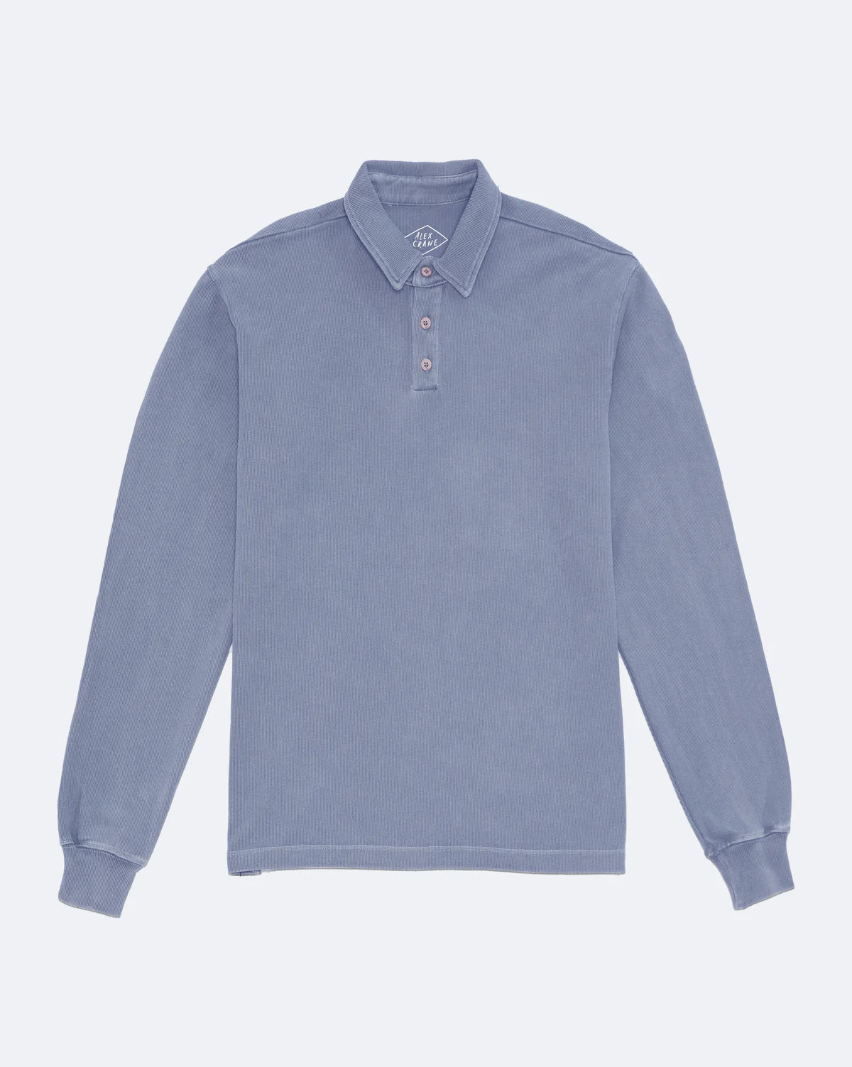 An ocean blue slubby cotton polo knit with 100% organic cotton, garment dyed with natural dyes, and washed with biodegradable softeners.