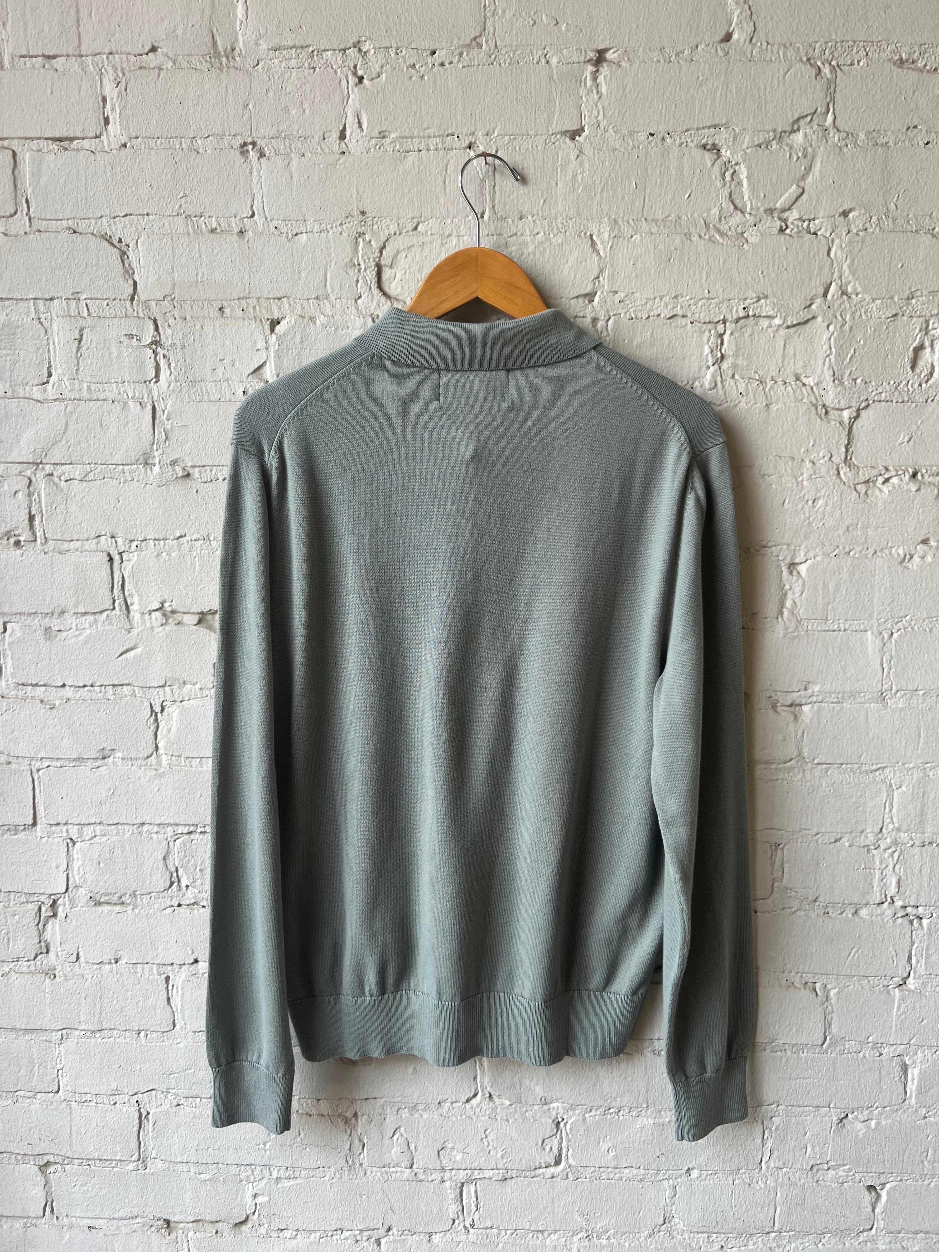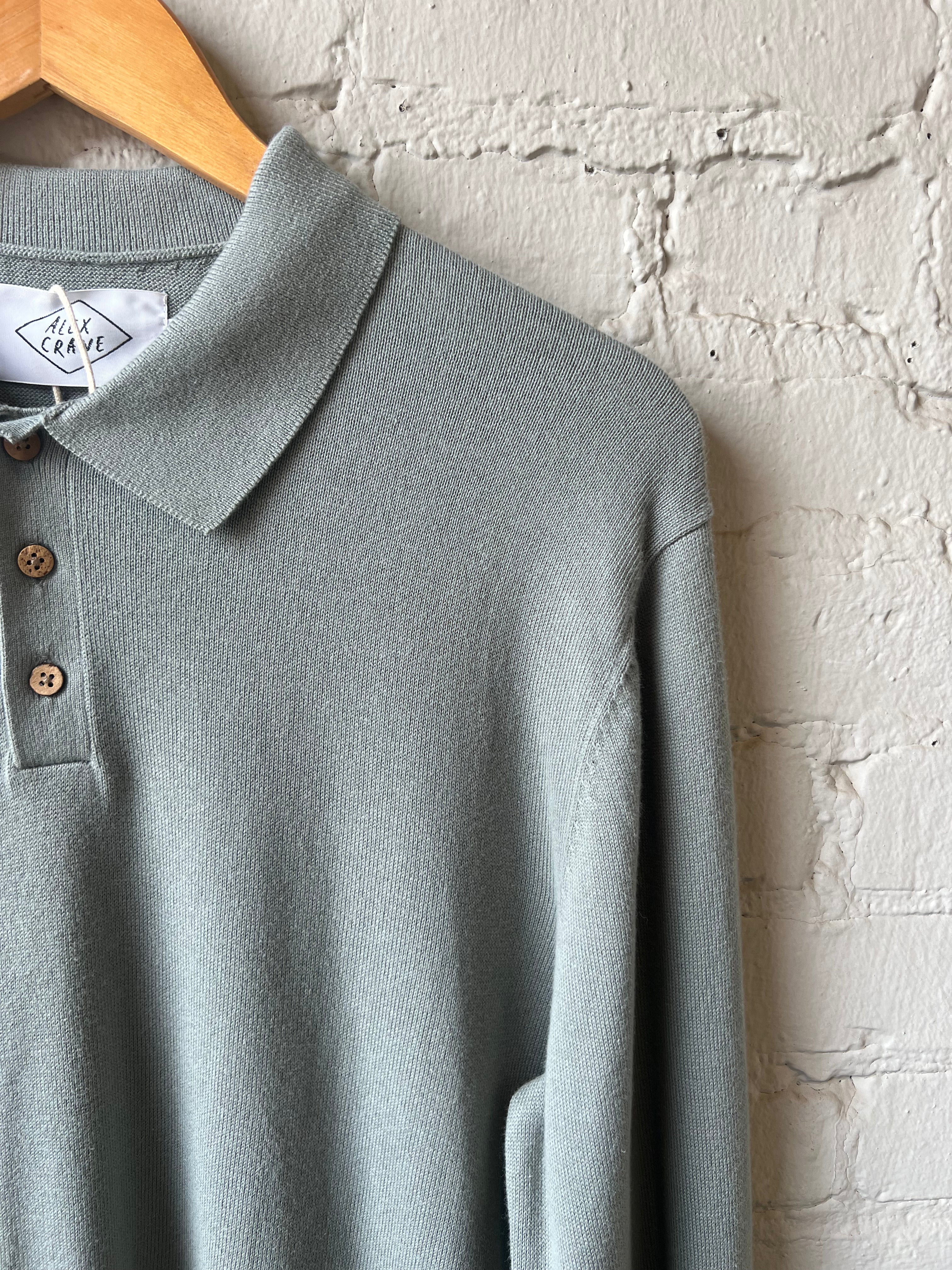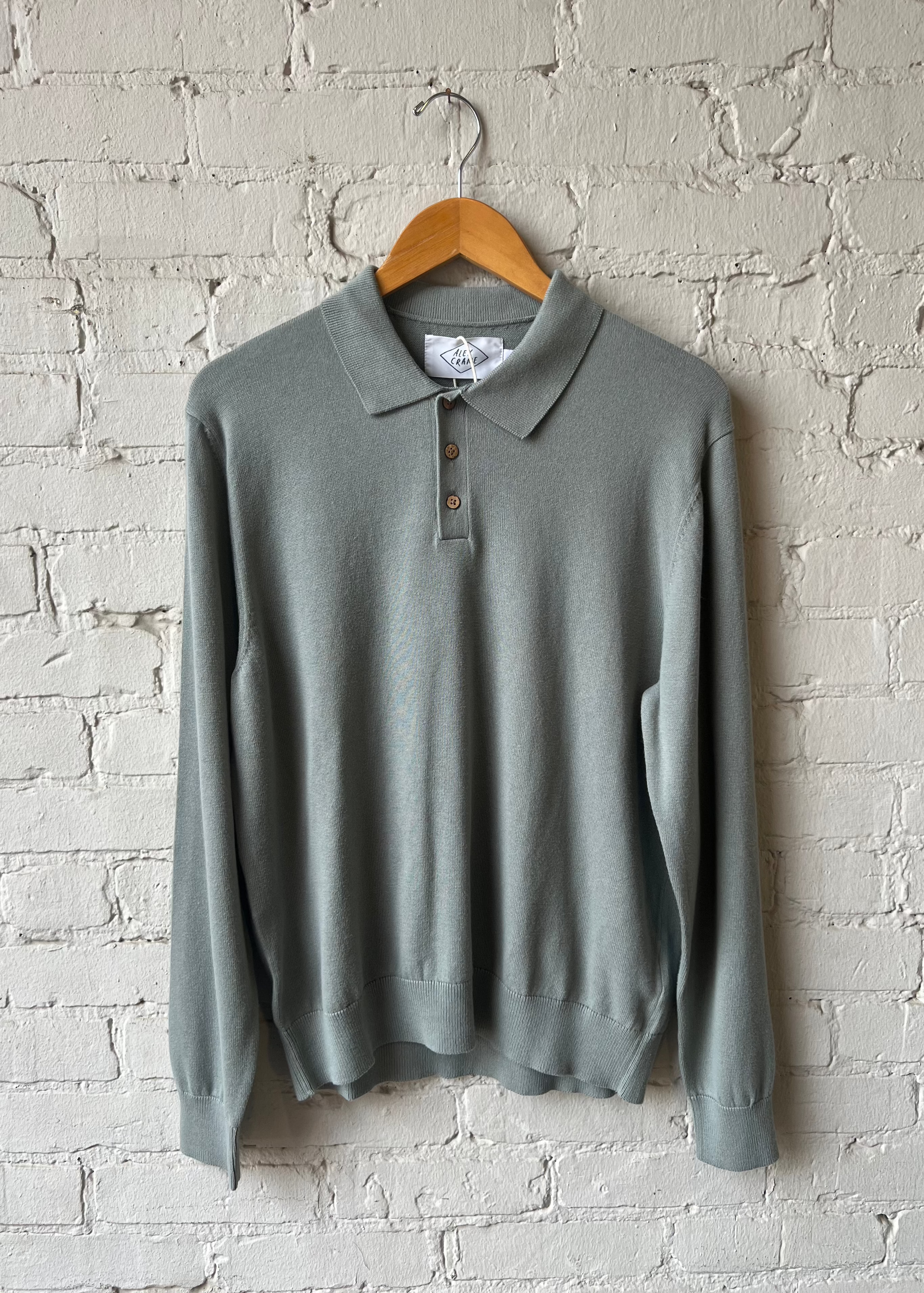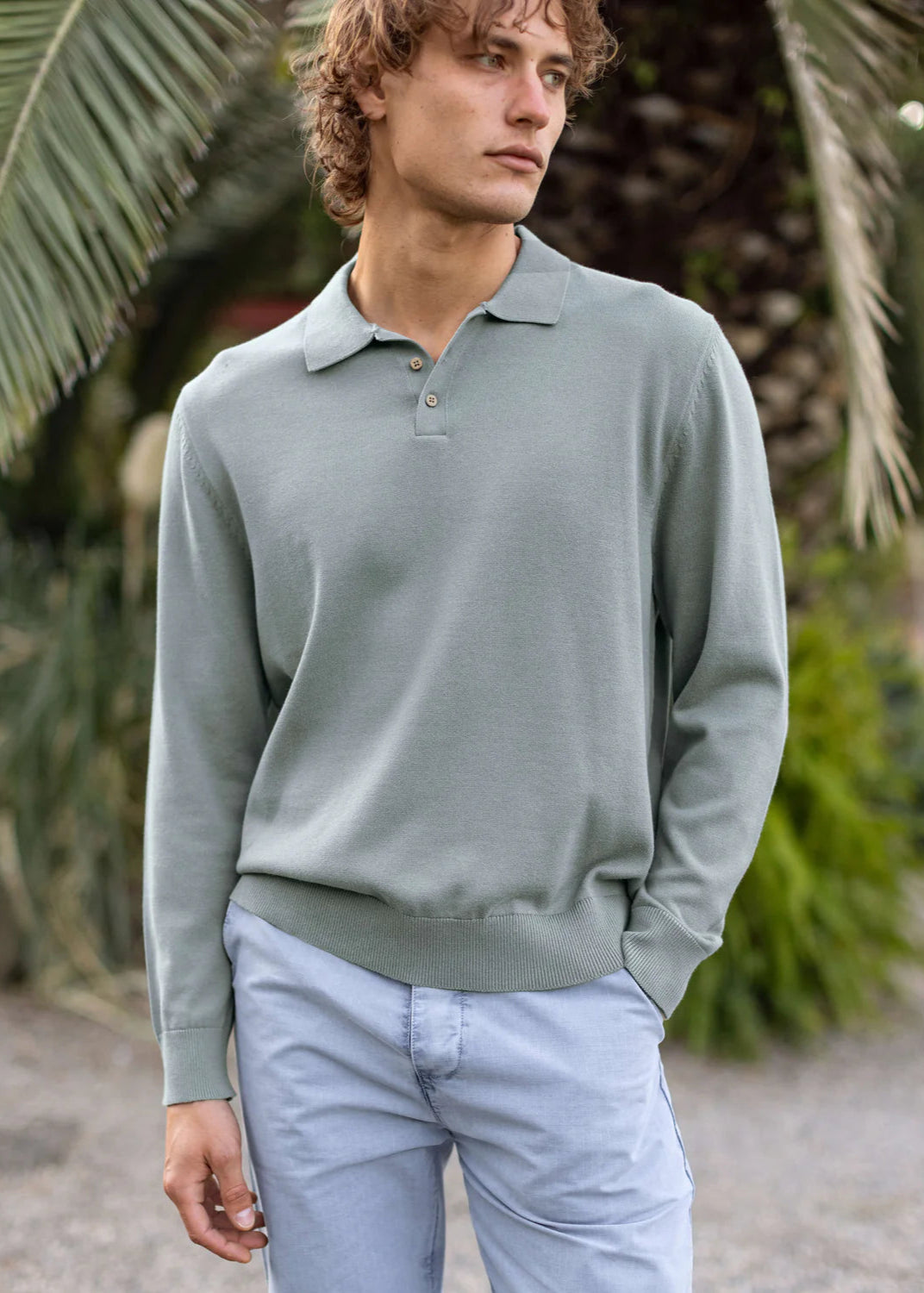 A mineral green yarn-dye knit polo made with 100% organic cotton and washed with biodegradable softeners.