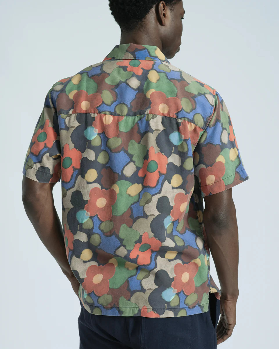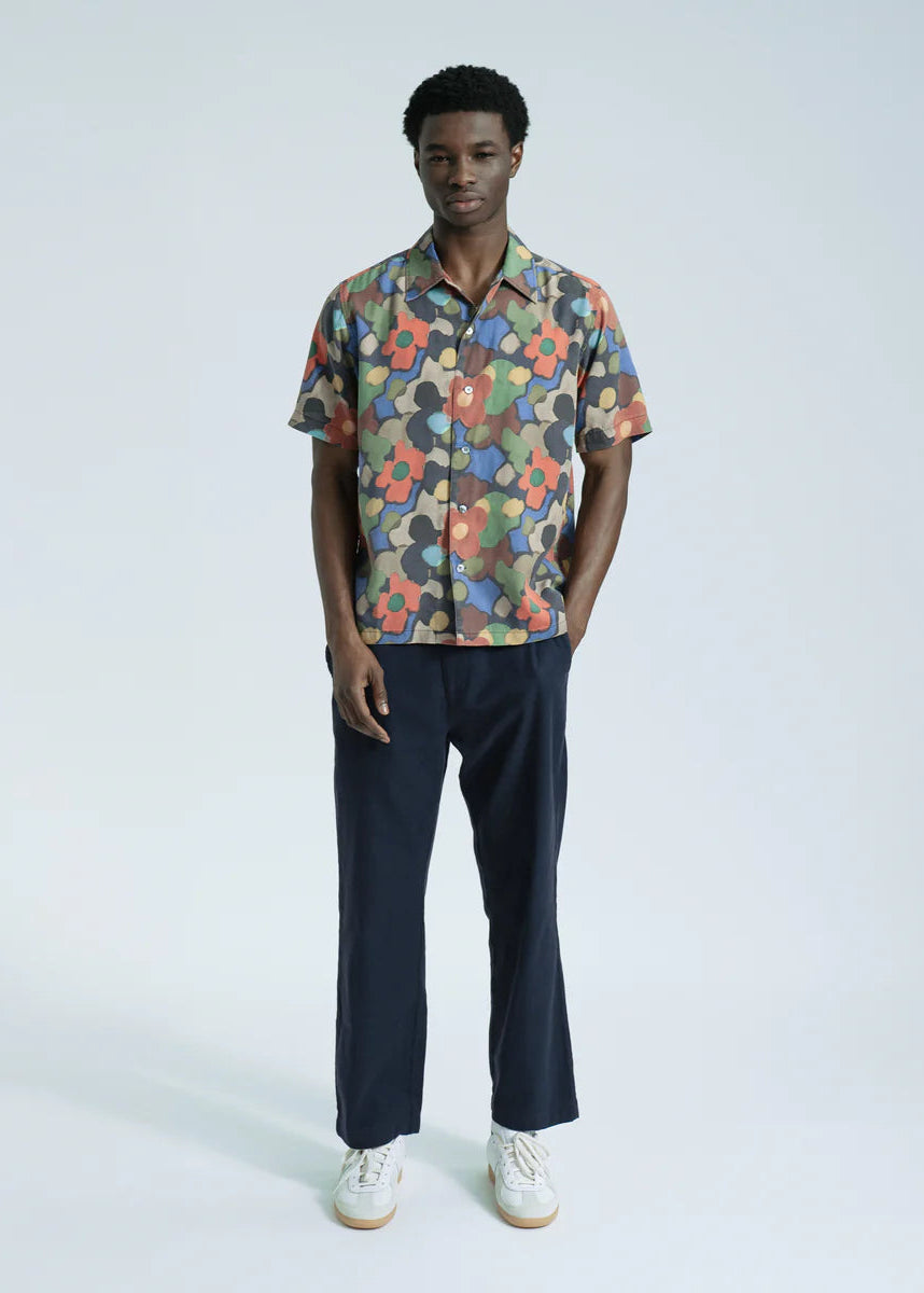 A relaxed short-sleeve shirt in smooth, silky Tencel™, printed with a soft-edged abstract floral in rich reds, blues and greens. Cut from a continuous length of patterned fabric, ensuring each piece has its own unique placement.