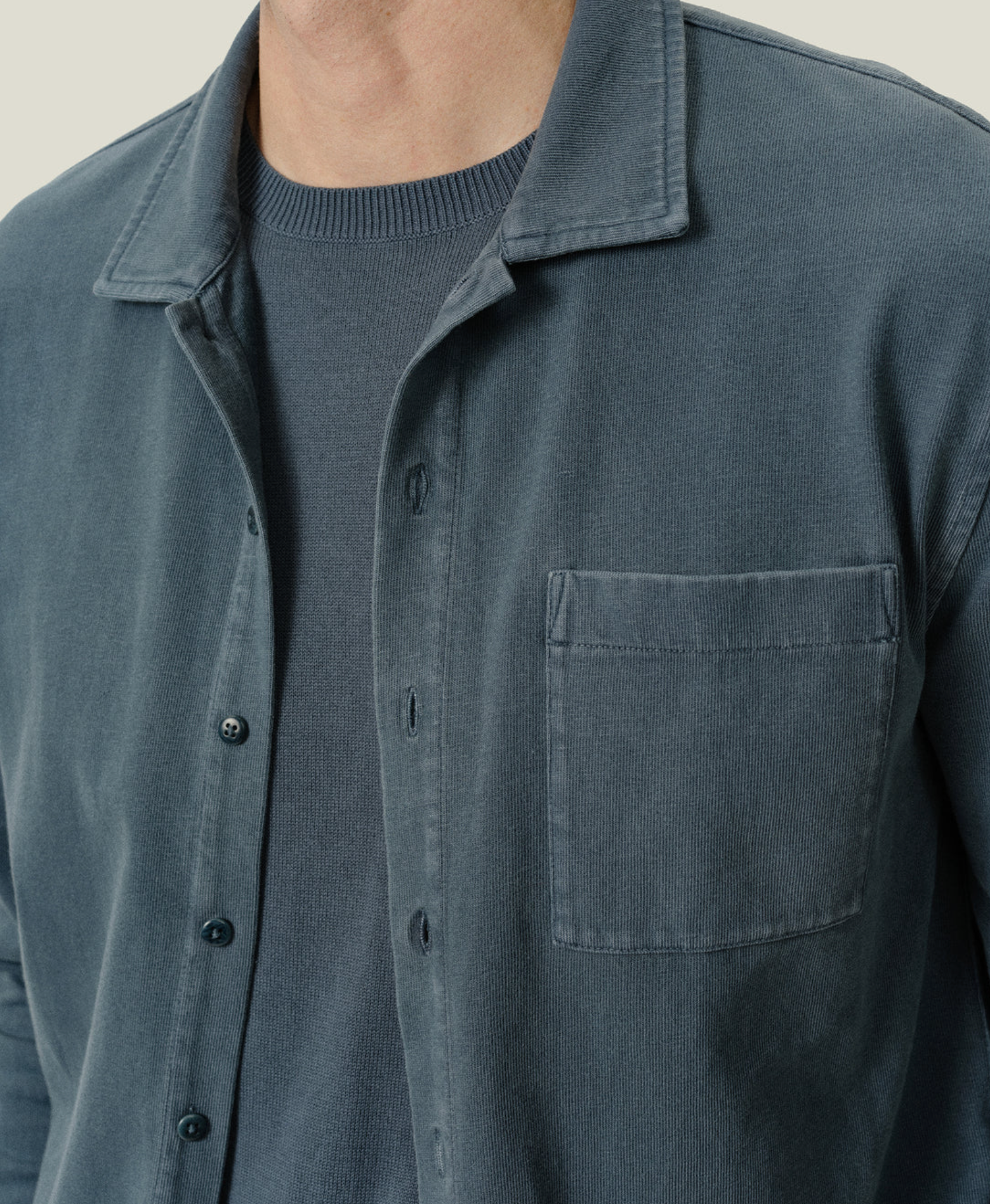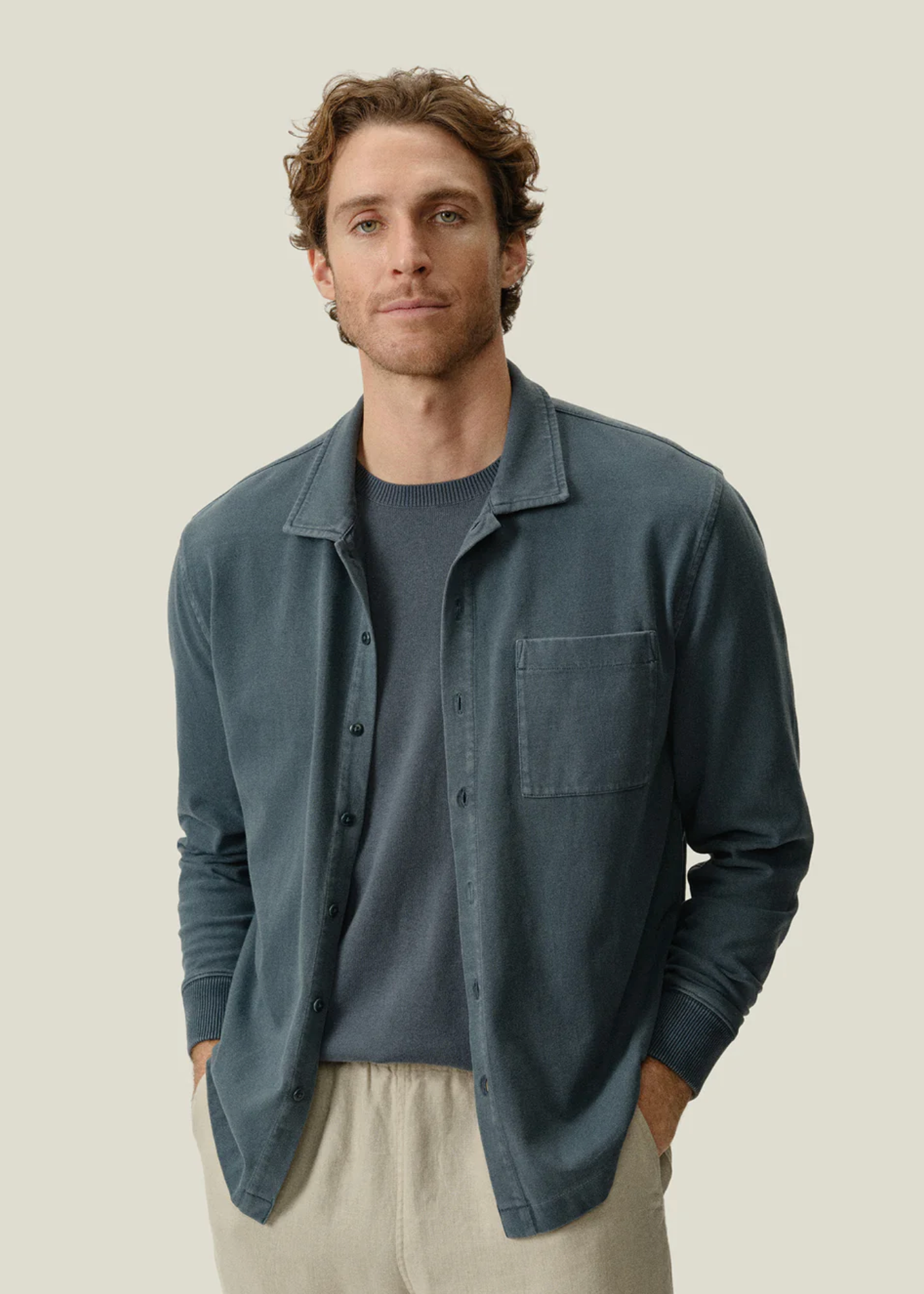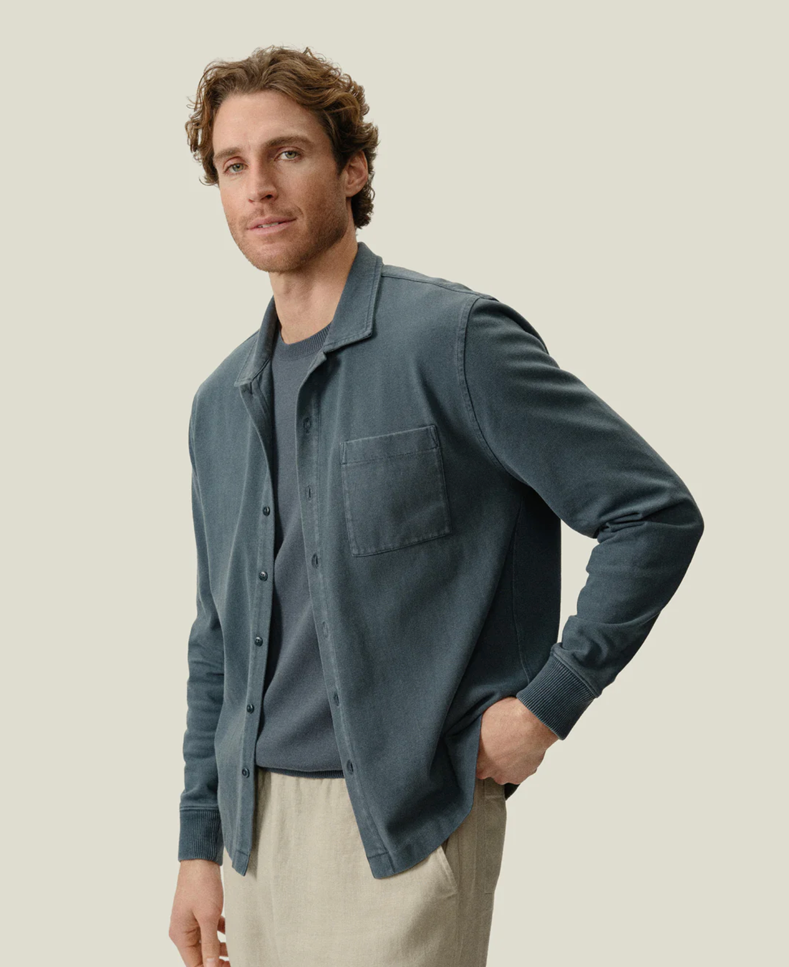 A mid-weight organic cotton knit shirt in a slubby rib, garment-dyed with atural mineral dyes a subtle, grounded green. Rib knit cuffs blend the ease of a sweater with the polish of a button-up. Finished with tonal corozo buttons. Cut from Punjab cotton, where cultivation began 6,000 years ago.