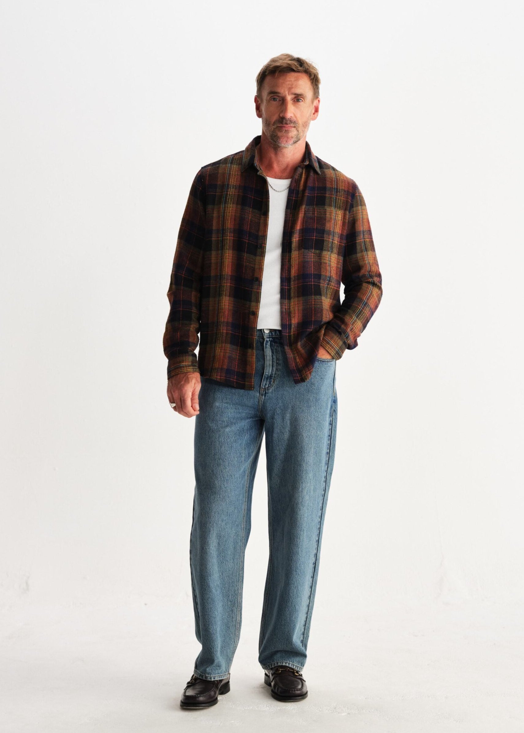 Cut for a relaxed fit, it’s crafted from soft brushed 100% cotton twill, sustainably made by a family-run mill in France. This edition features a bold multicoloured check with shades of rust, navy, yellow and brown running through it.