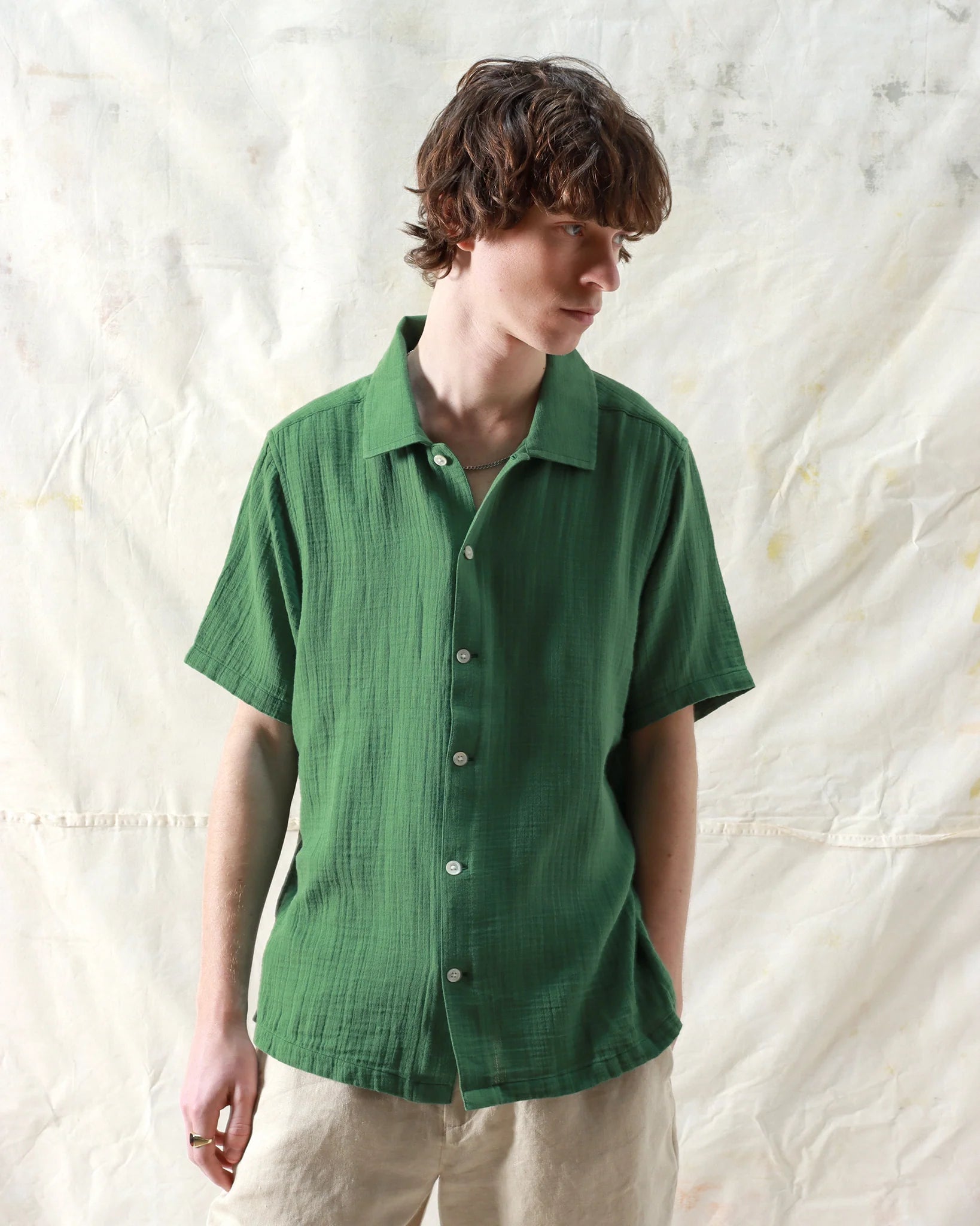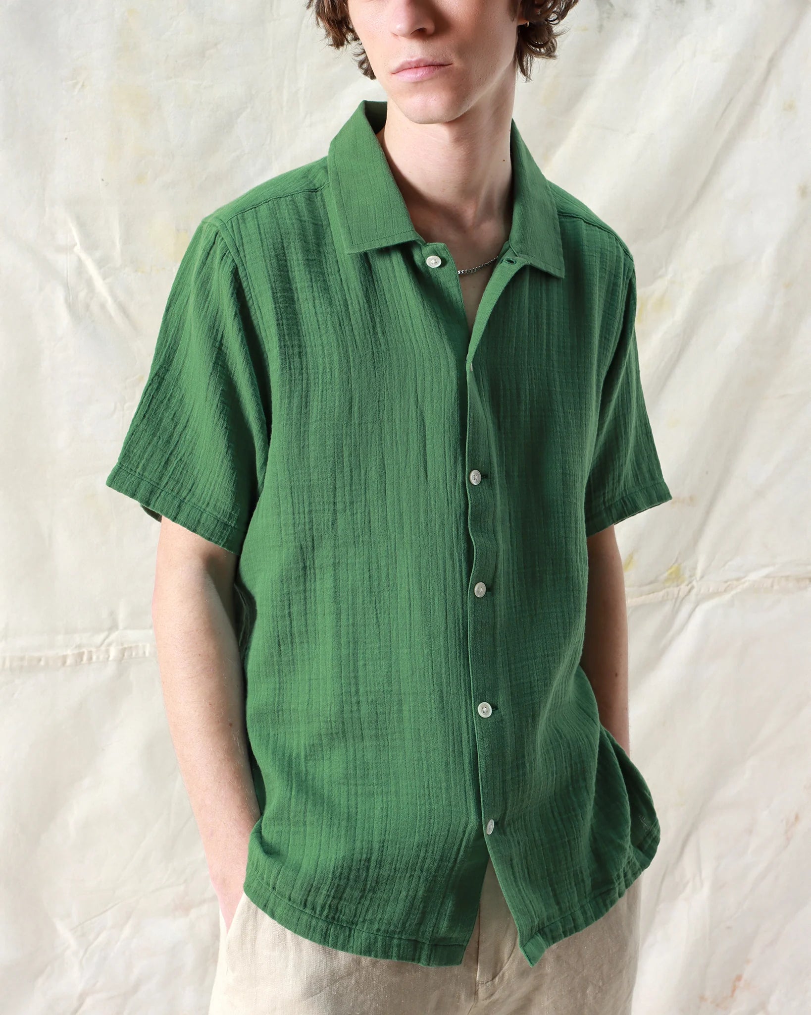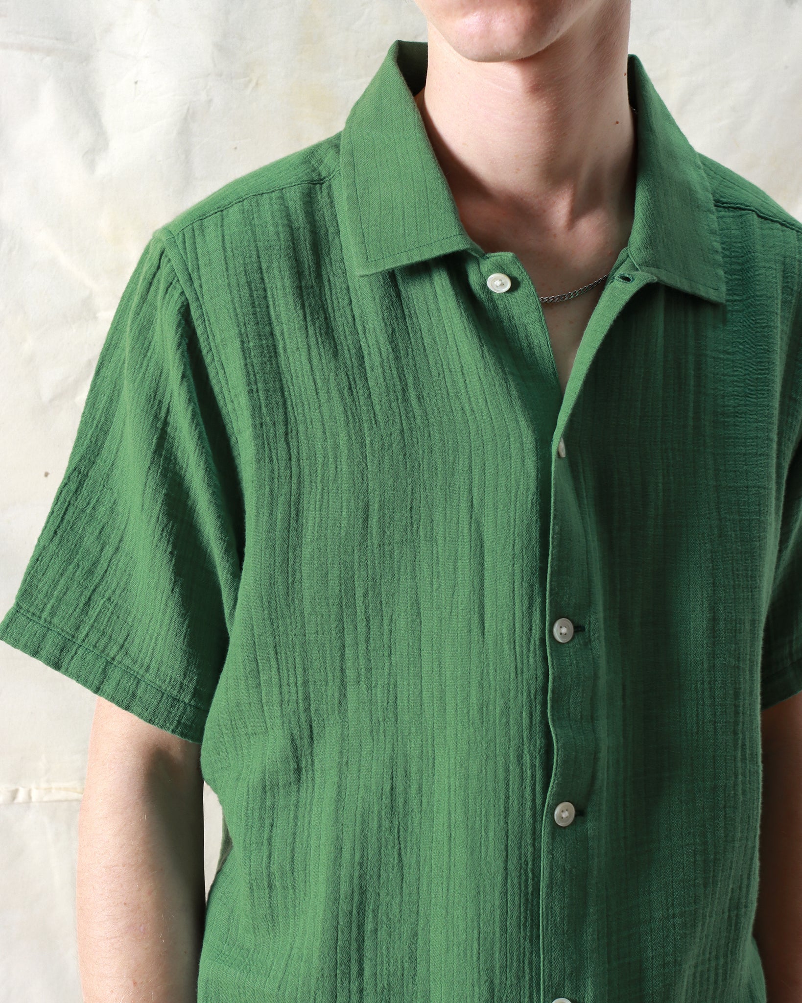 An airy short-sleeve shirt cut to a slightly cropped, boxy fit. Made from lightweight, breathable double cloth cotton with a distinctive grid-like finish that adds depth and texture.
