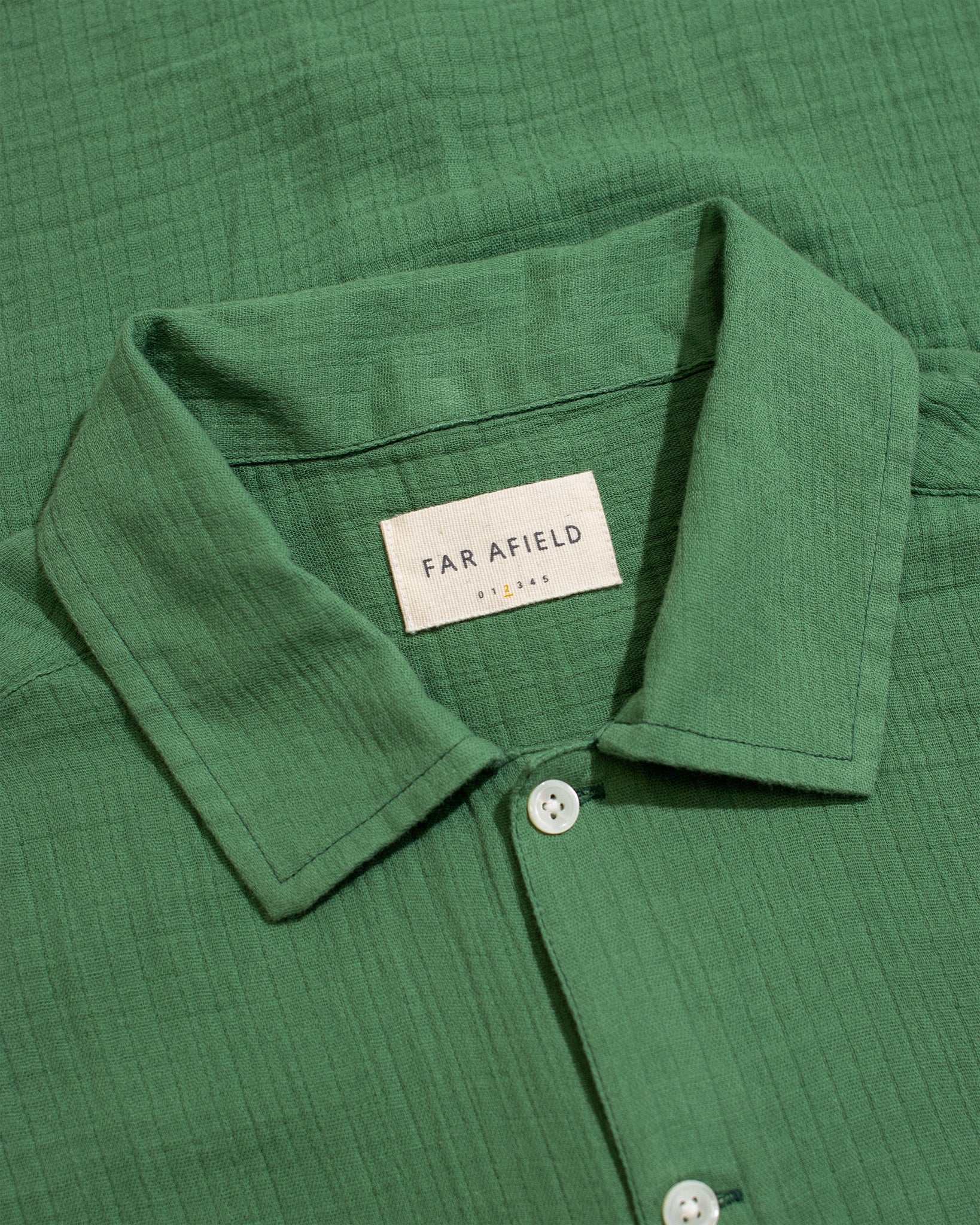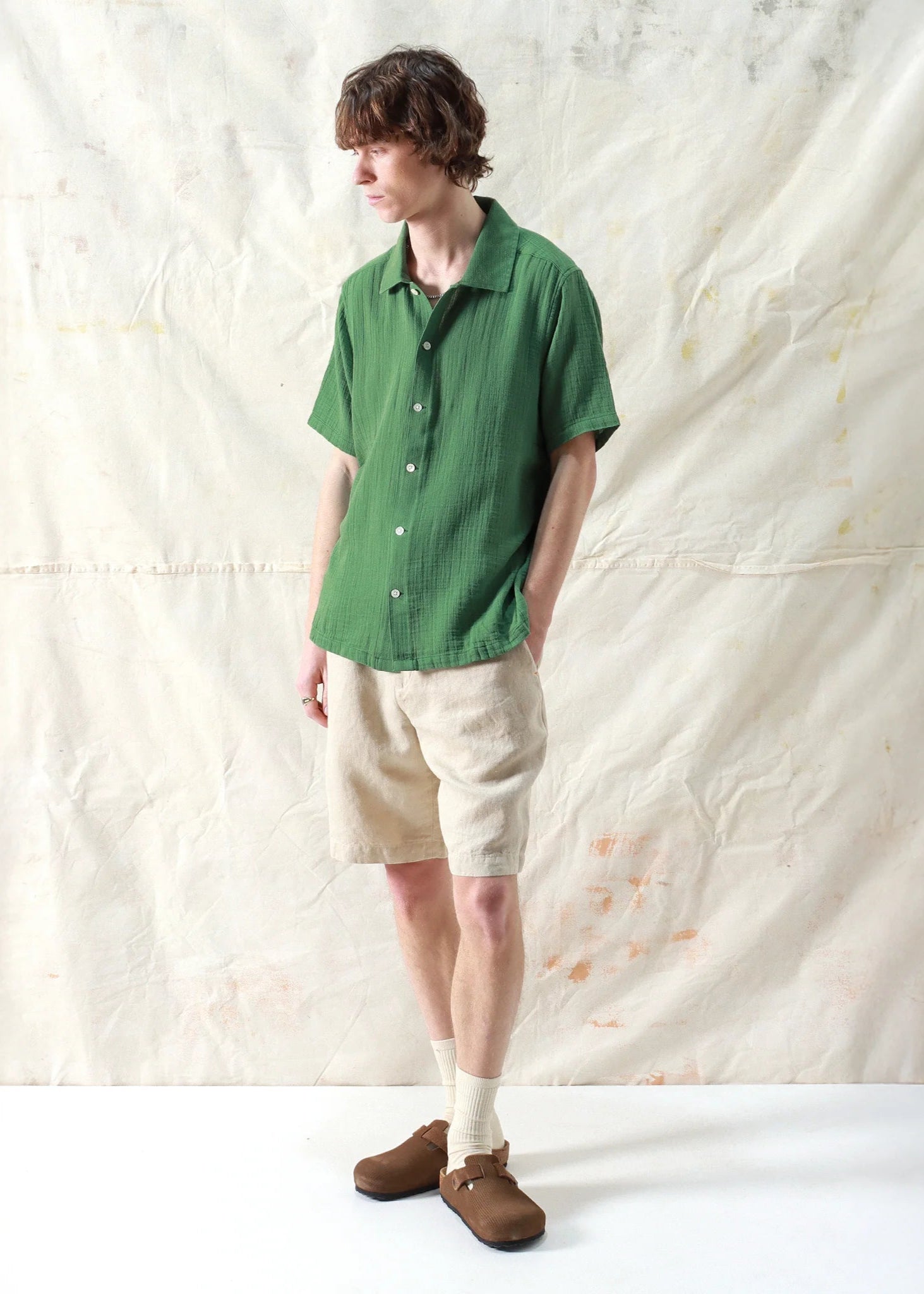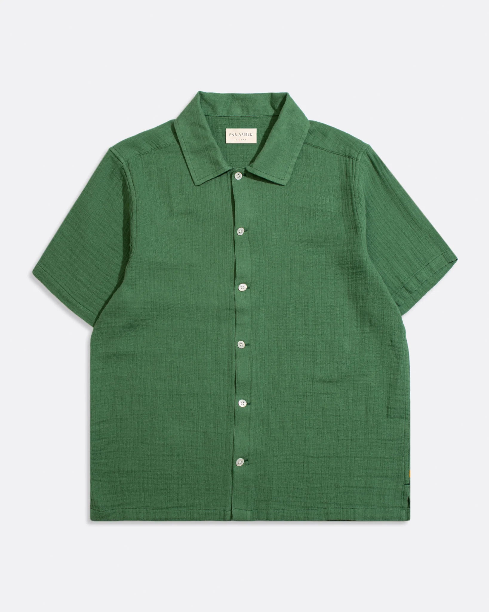 An airy short-sleeve shirt cut to a slightly cropped, boxy fit. Made from lightweight, breathable double cloth cotton with a distinctive grid-like finish that adds depth and texture.