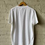 White t-shirt with 'Michigan Summers' text on a wooden hanger against a brick wall.