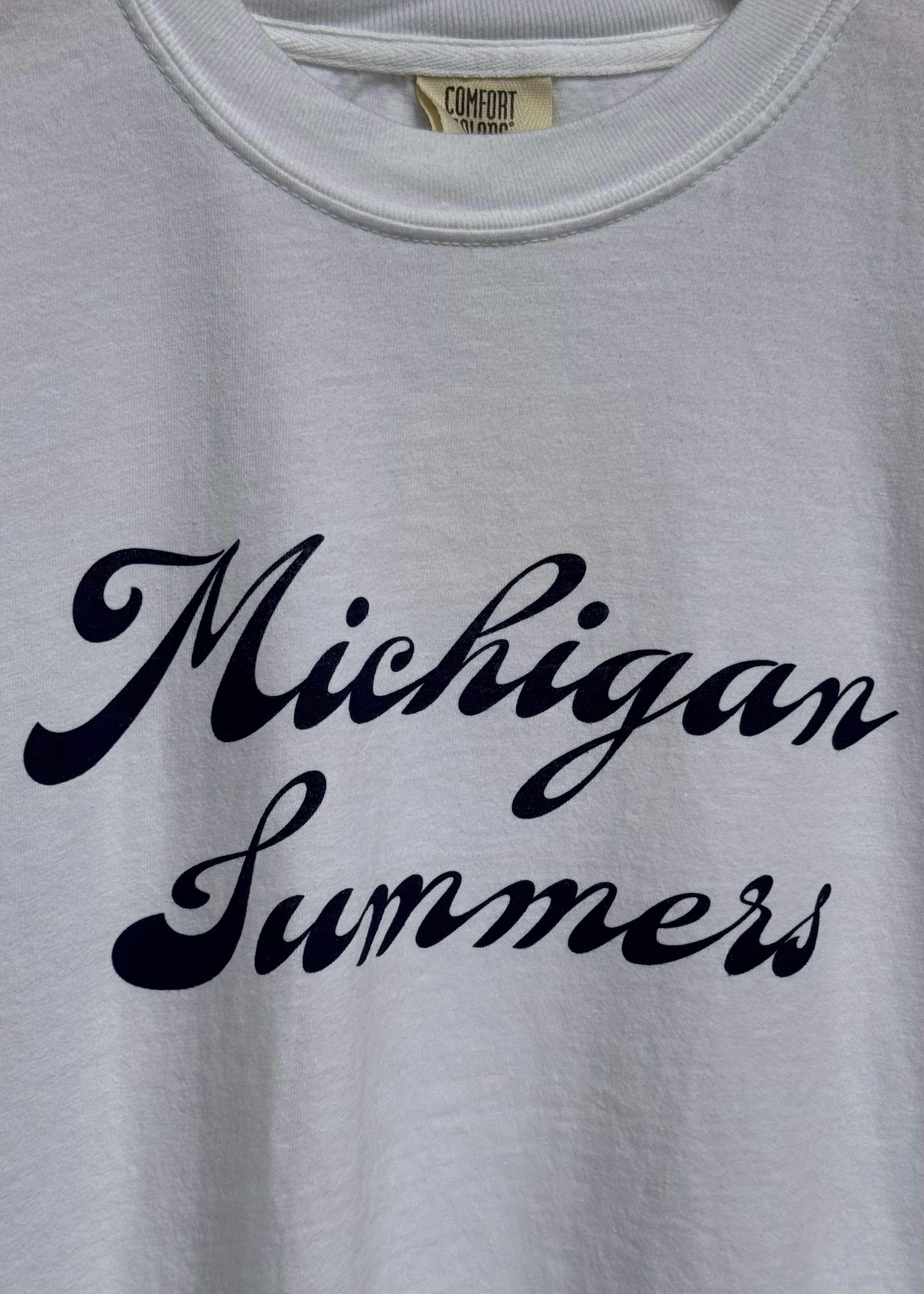• ”Michigan Summers” is in navy text on a solid white t-shirt