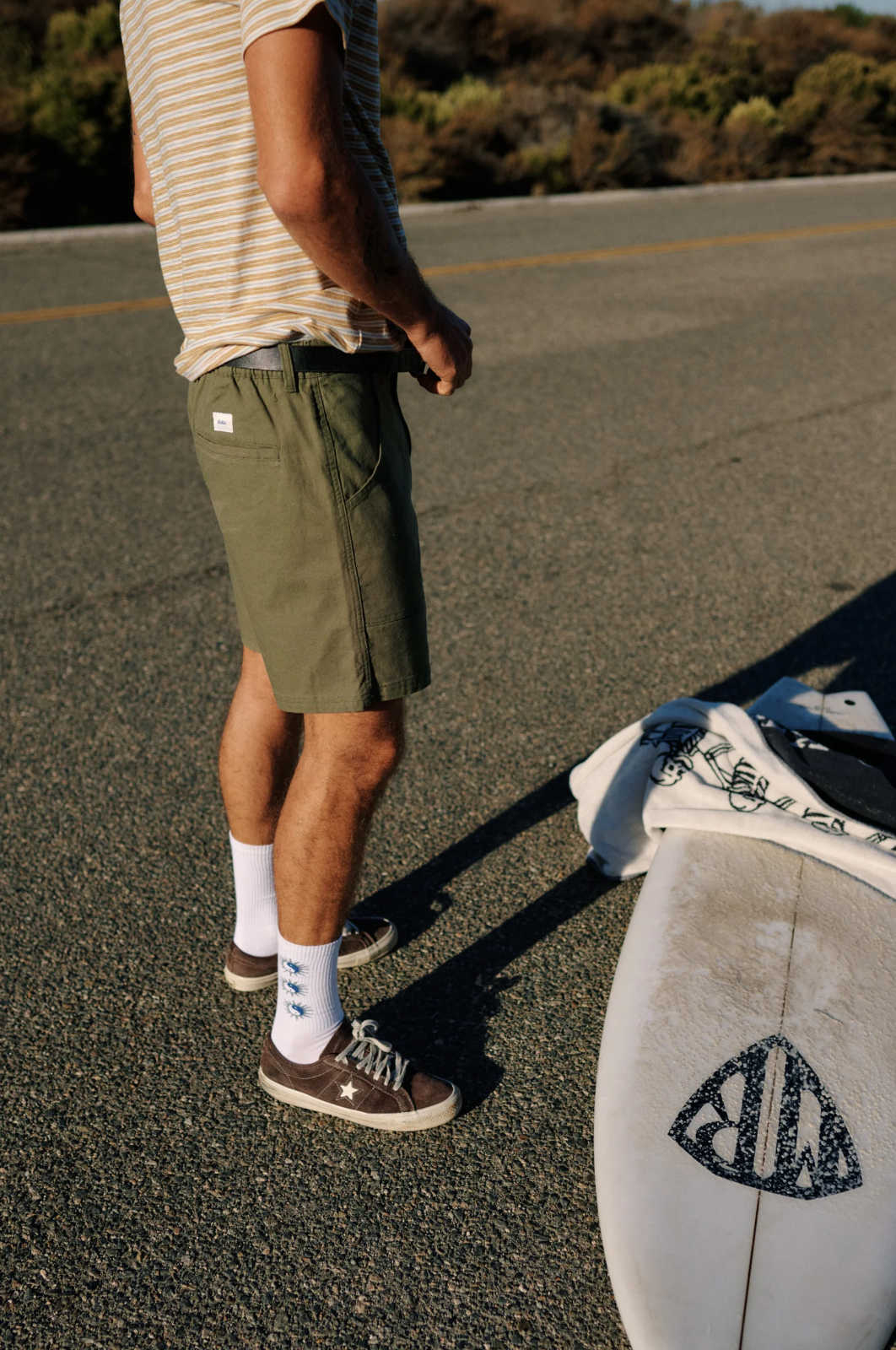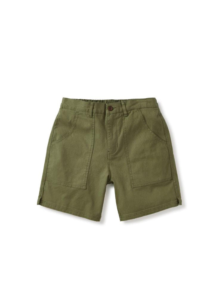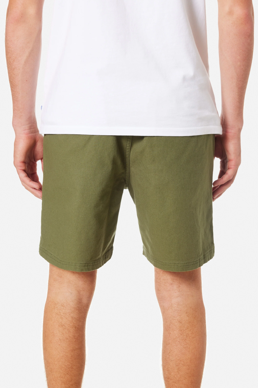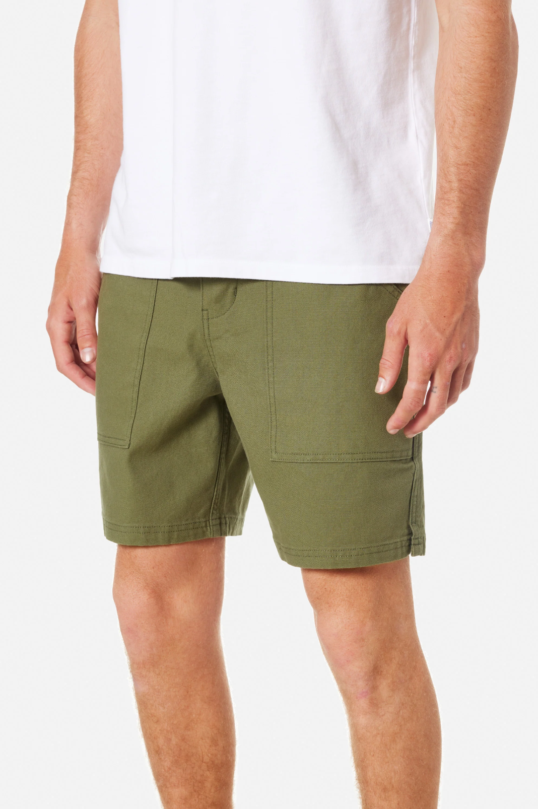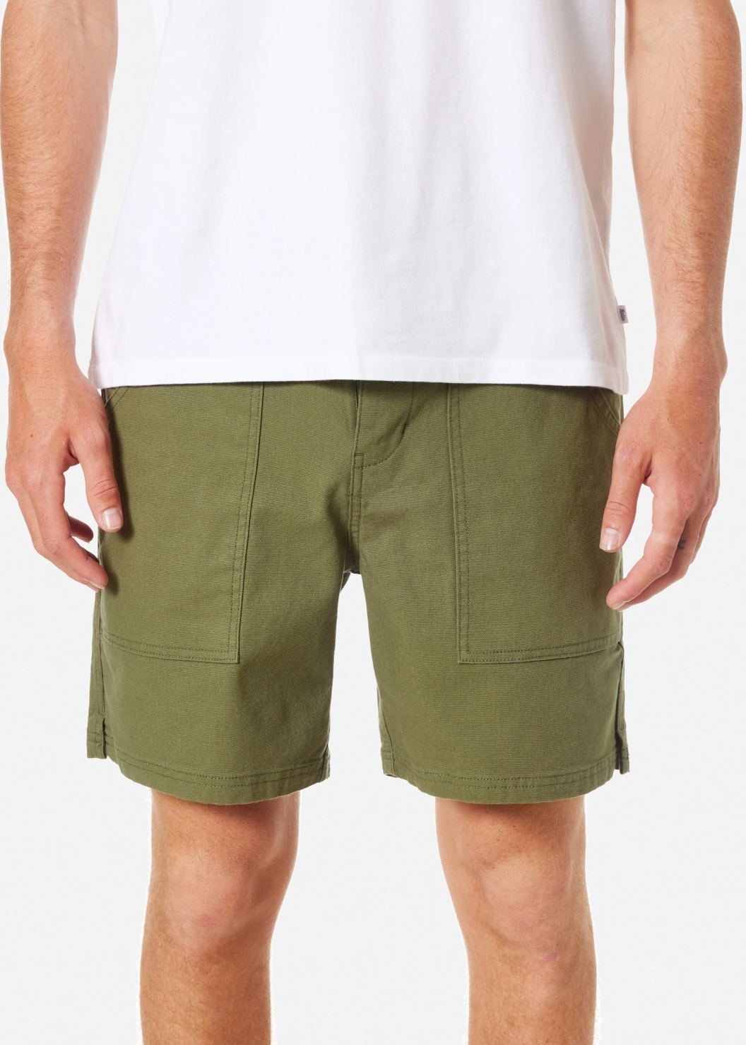 Made from a durable cotton canvas spandex fabric, the Trails Short has a 17" out seam and features an elastic waistband, front patch pocket, back welt pockets, notched side seam hem, faux fly and interior binding.