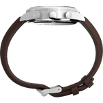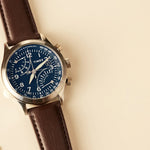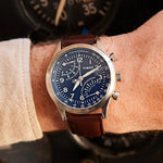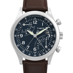 Built with their proprietary fly back chronograph movement designed in Pforzheim, Germany, the dial of their Waterbury Traditional Fly Back Chronograph watch houses fan-shaped sub-dials at the 4 o'clock and 10 o'clock positions with retrograde hands. A single press of the fly back pusher instantly resets the chronograph to display the current time in the current lap without the need to stop and reset, and when the chronograph isn’t in use, the upper sub-dial doubles as a second time zone indicator.