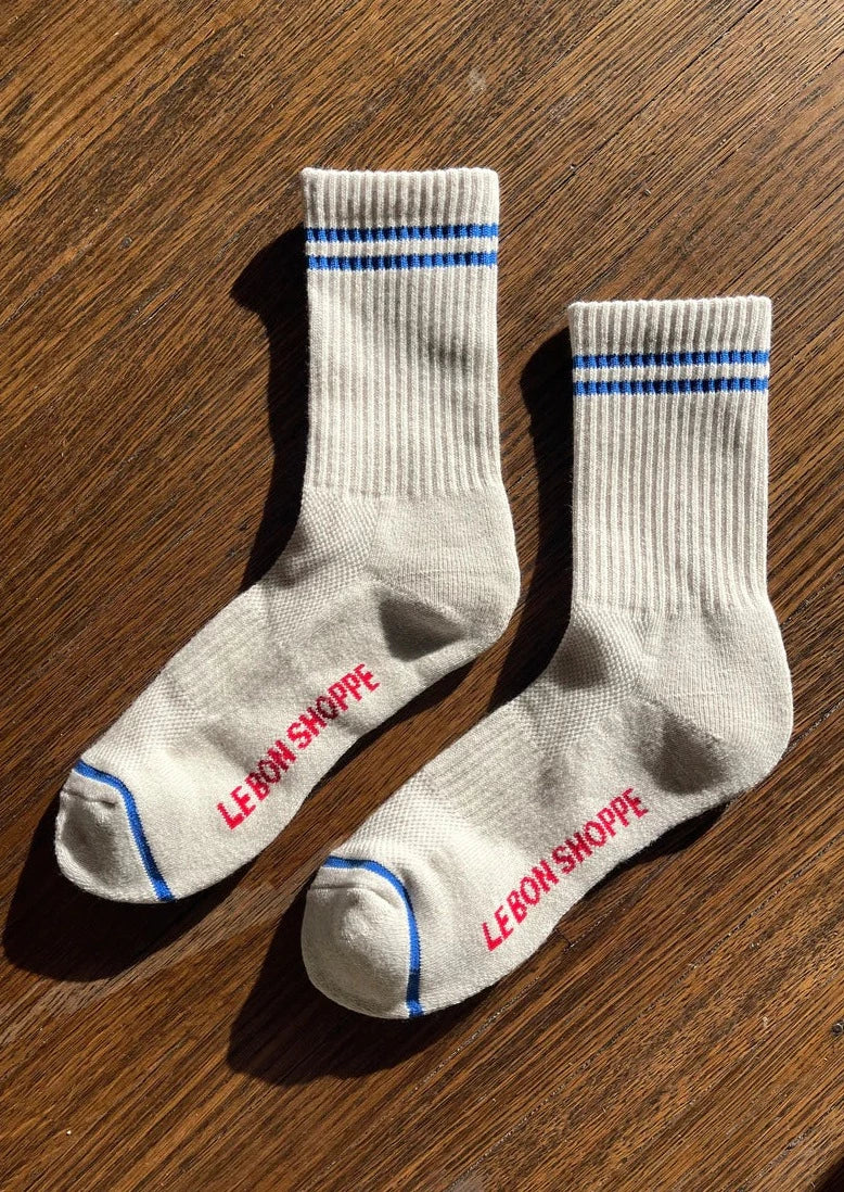 The Boyfriend Sock is a staff favorite. They are the perfect mix of function and fashion creating an effortless sporty vintage charm to any outfit. They are slightly longer than a classic crew and have a contrast double stripe. Durable and comfortable, they upgrade any outfit. Works with well-worn denim and Converse chucks.