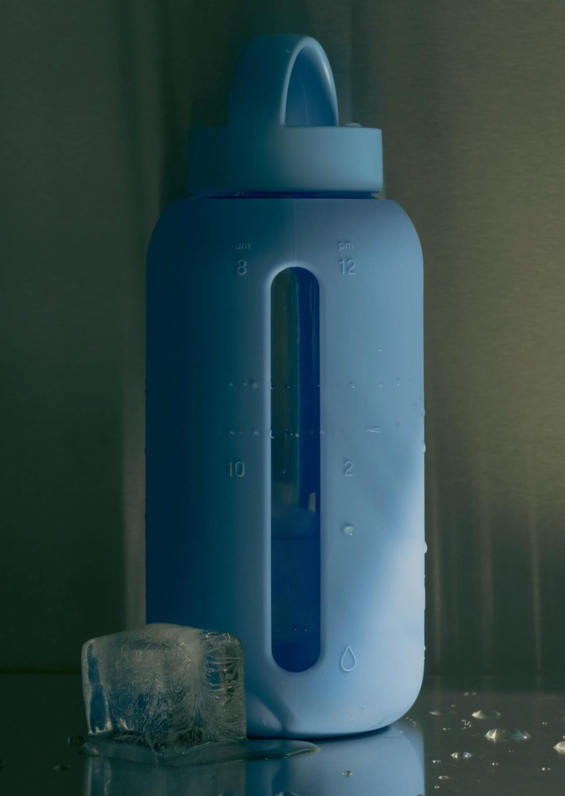 The first glass hydration tracking bottle designed to help you drink the recommended amount of water each day. Featuring simple-to-follow am/pm markings to guide you