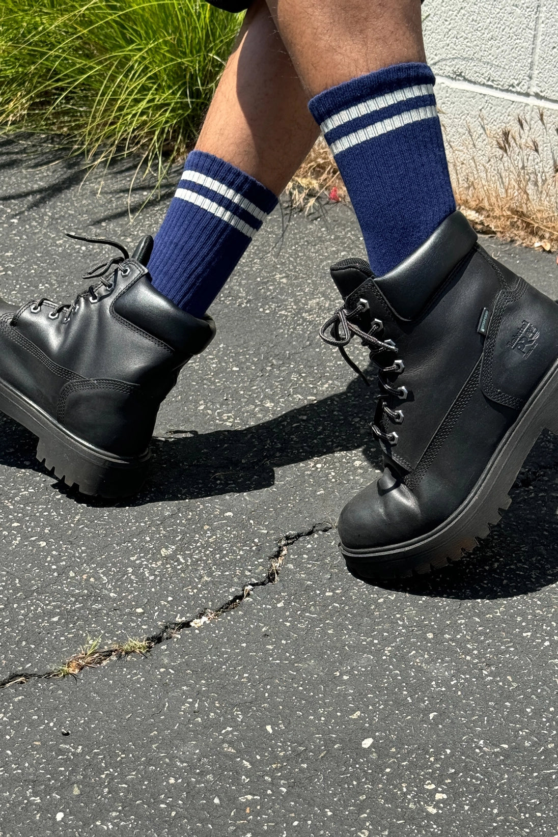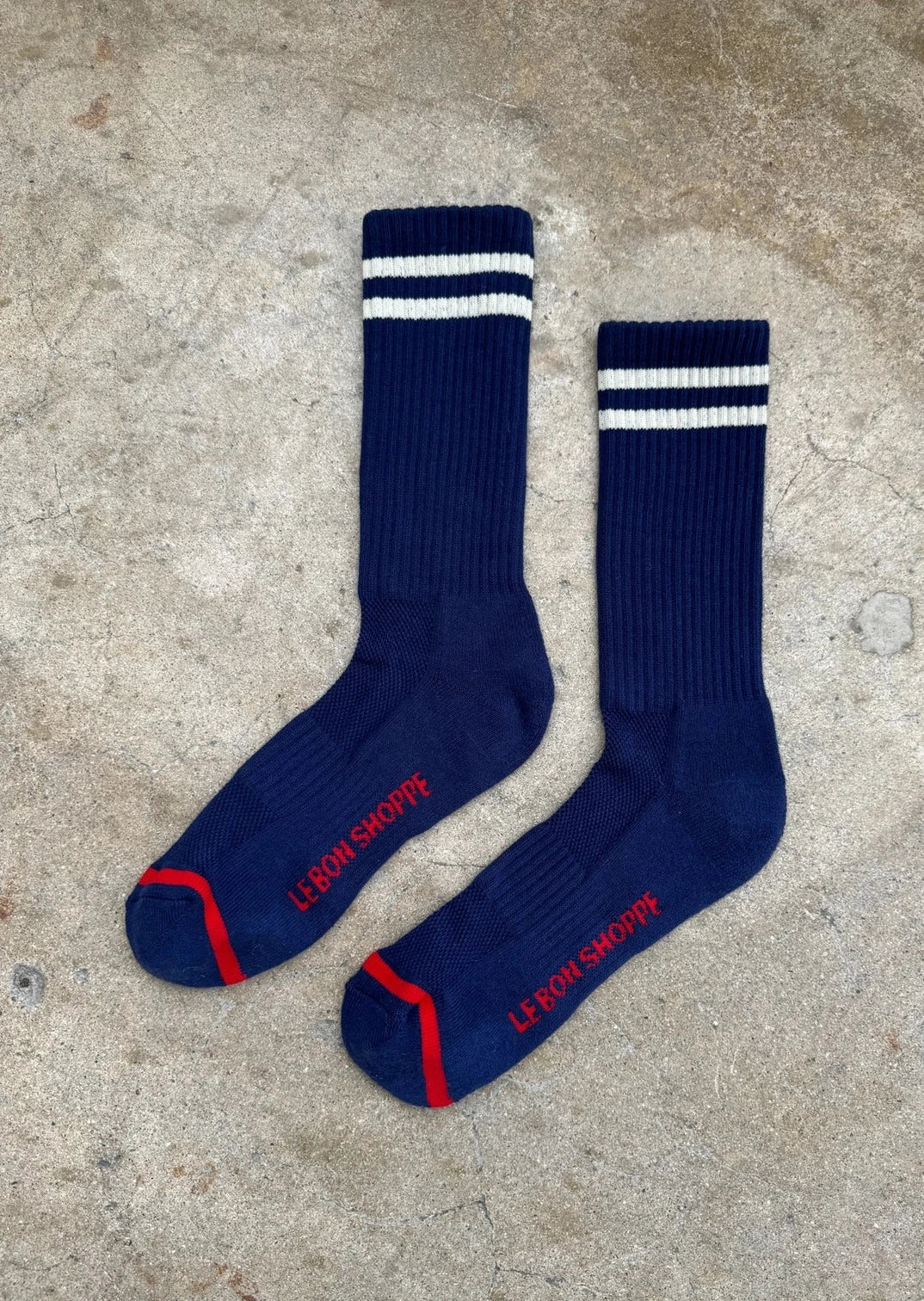 The Boyfriend Socks Extended is a calf length sport sock. They have a classic vintage sporty look but can be styled with all of your daytime looks and our favorite socks to lounge around the house.