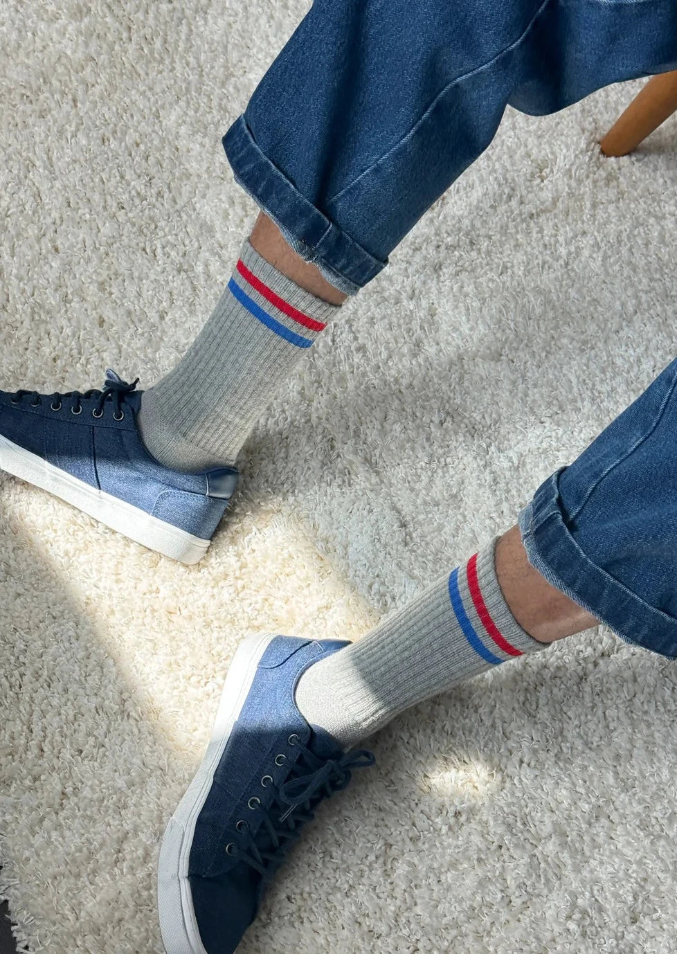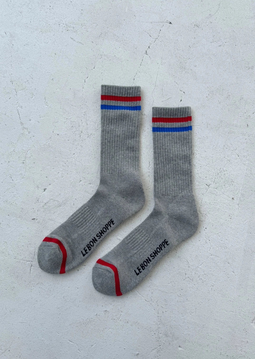 The Boyfriend Socks Extended is a calf length sport sock. They have a classic vintage sporty look but can be styled with all of your daytime looks and our favorite socks to lounge around the house.