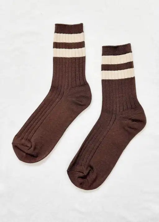 A bold varsity stripe is timeless and always a classic. Her Varsity Socks is a varsity striped style that is classically ribbed, perfect height, cotton blend durable, chic go to socks. Add an understated sporty touch to any look. Style with a mini skirt, plaids, and oversized cable knit sweaters.