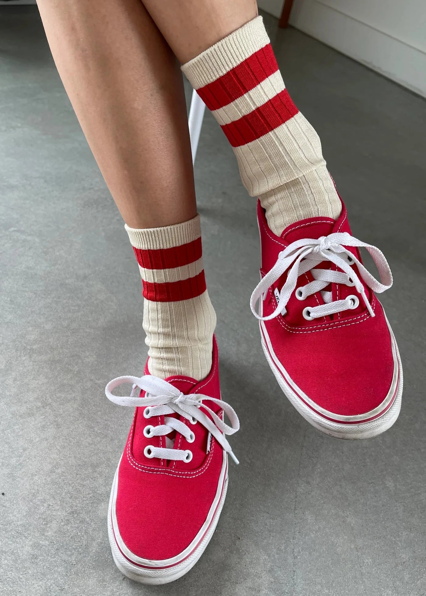 A bold varsity stripe is timeless and always a classic. Her Varsity Socks is a varsity striped style that is classically ribbed, perfect height, cotton blend durable, chic go to socks. Add an understated sporty touch to any look. Style with a mini skirt, plaids, and oversized cable knit sweaters.