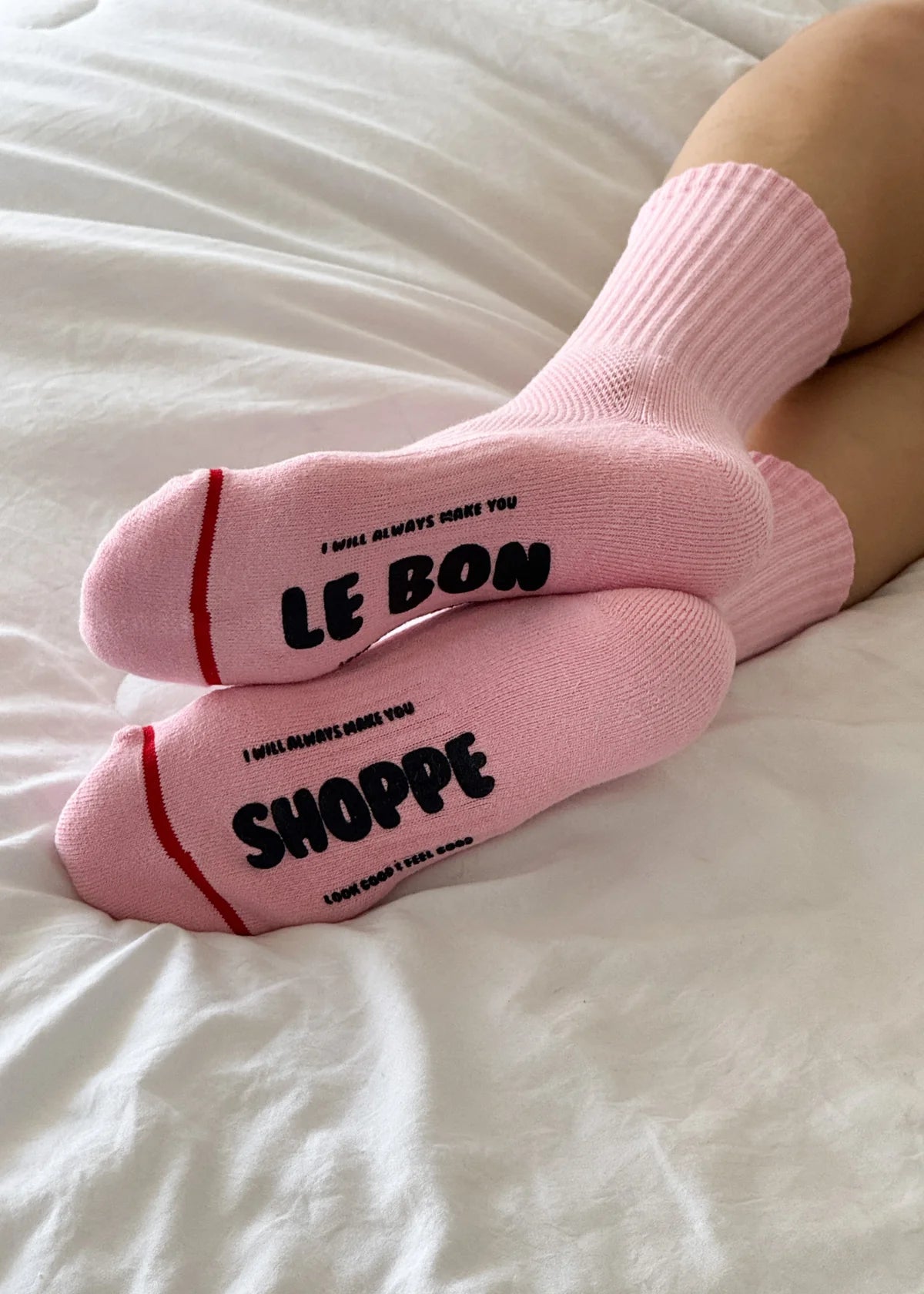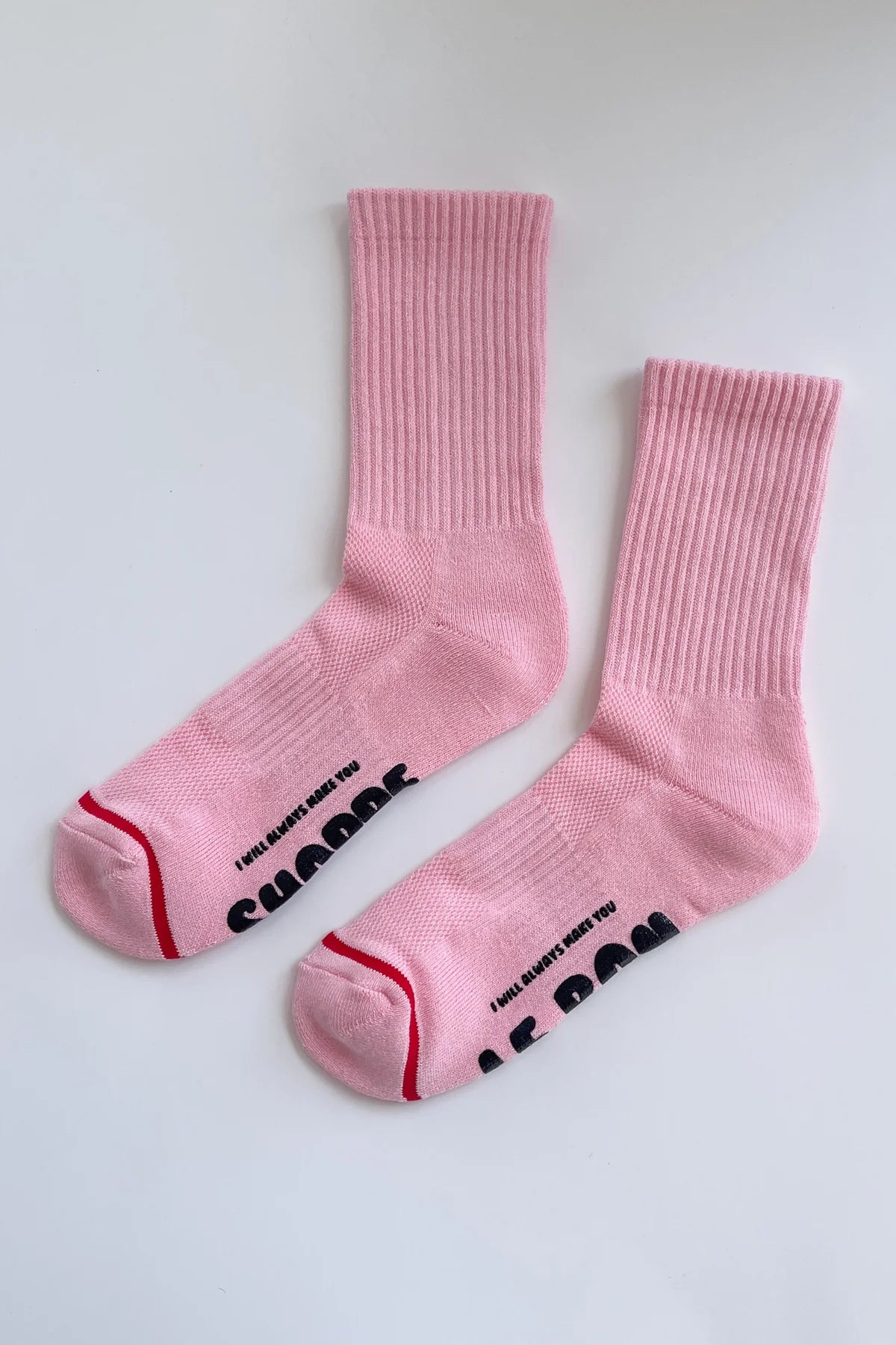 The introvert with a bubbly personality. Say hi to the Hugger Socks. Built on the same classic crew-length base as the Boyfriend Socks, with a clean, solid leg and a playful surprise underneath. A silicone motif on the sole adds a light grip, perfect for hugging flats, clogs, and slides.