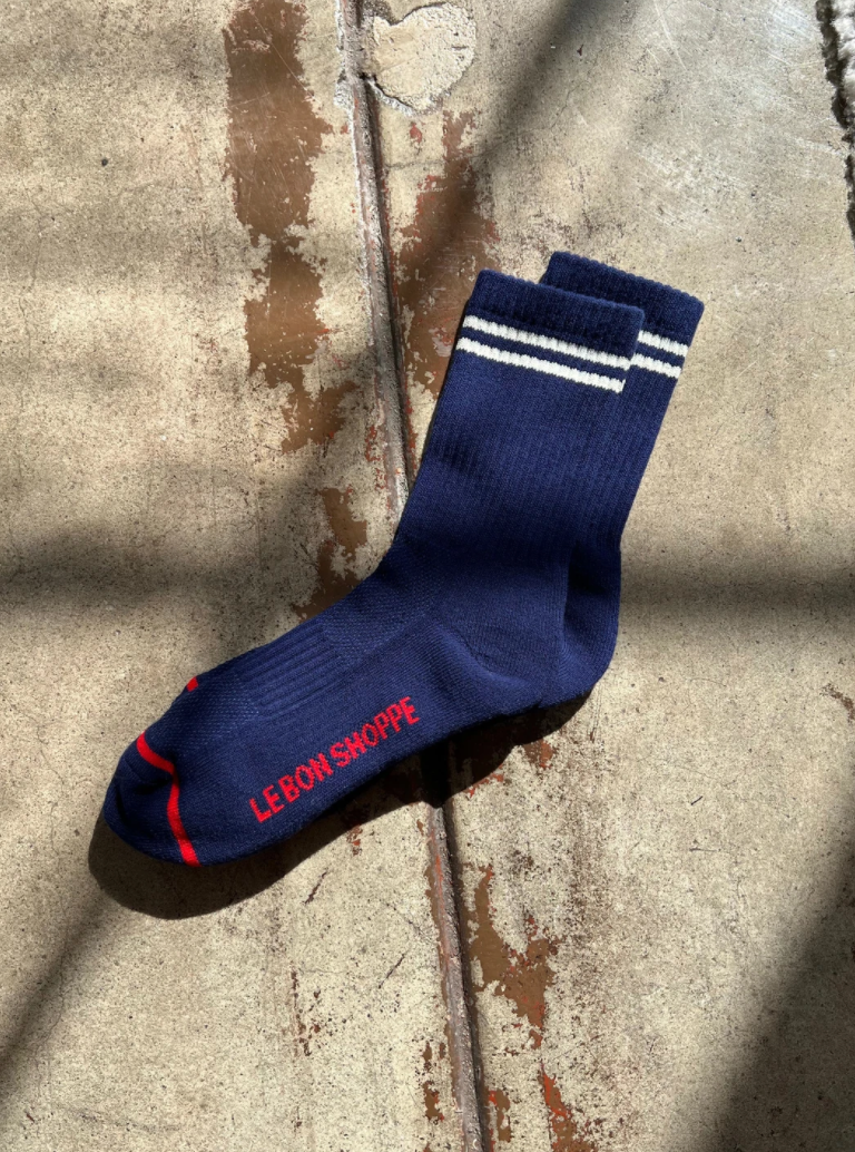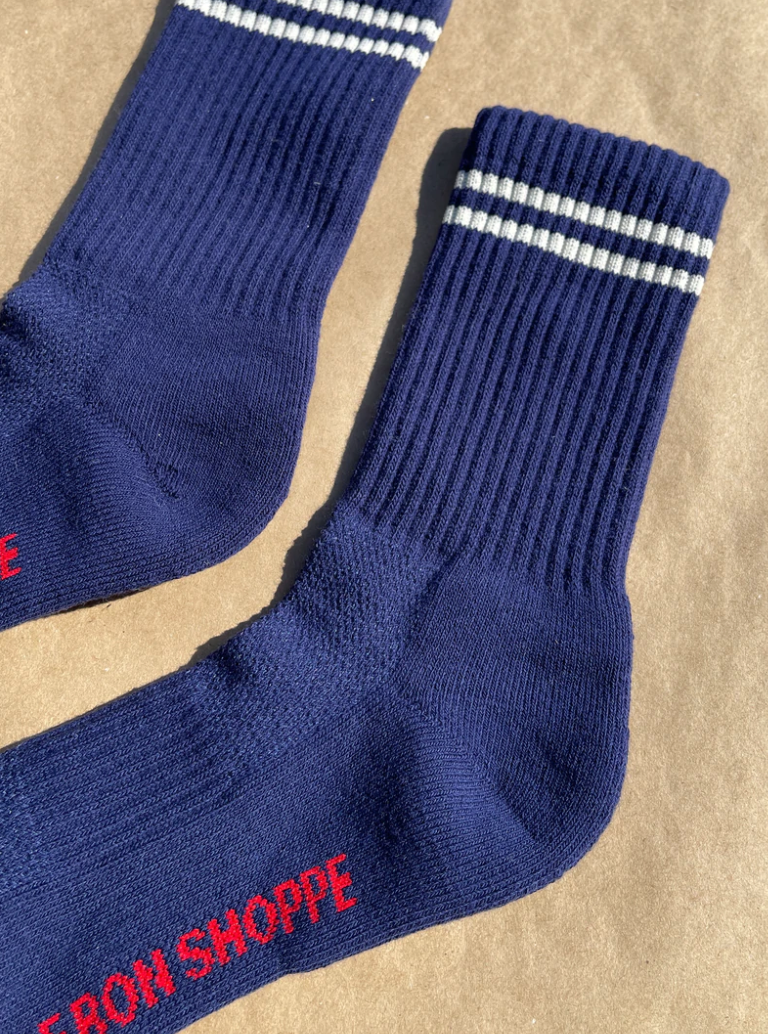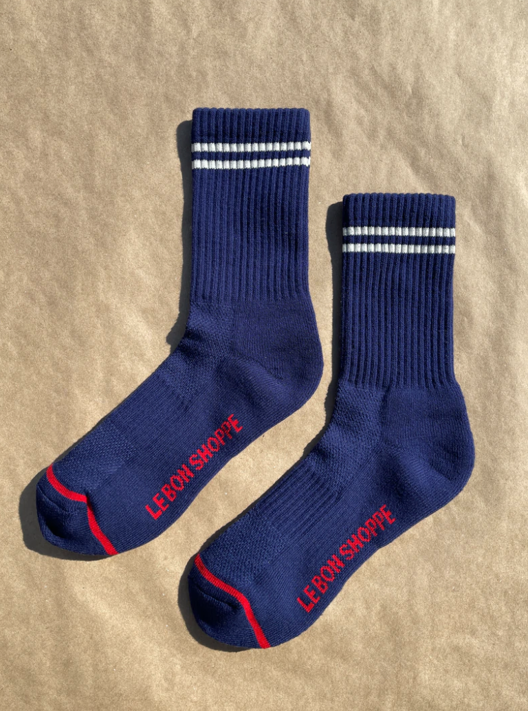 The Boyfriend Sock is a staff favorite. They are the perfect mix of function and fashion creating an effortless sporty vintage charm to any outfit. They are slightly longer than a classic crew and have a contrast double stripe. Durable and comfortable, they upgrade any outfit. Works with well-worn denim and Converse chucks.