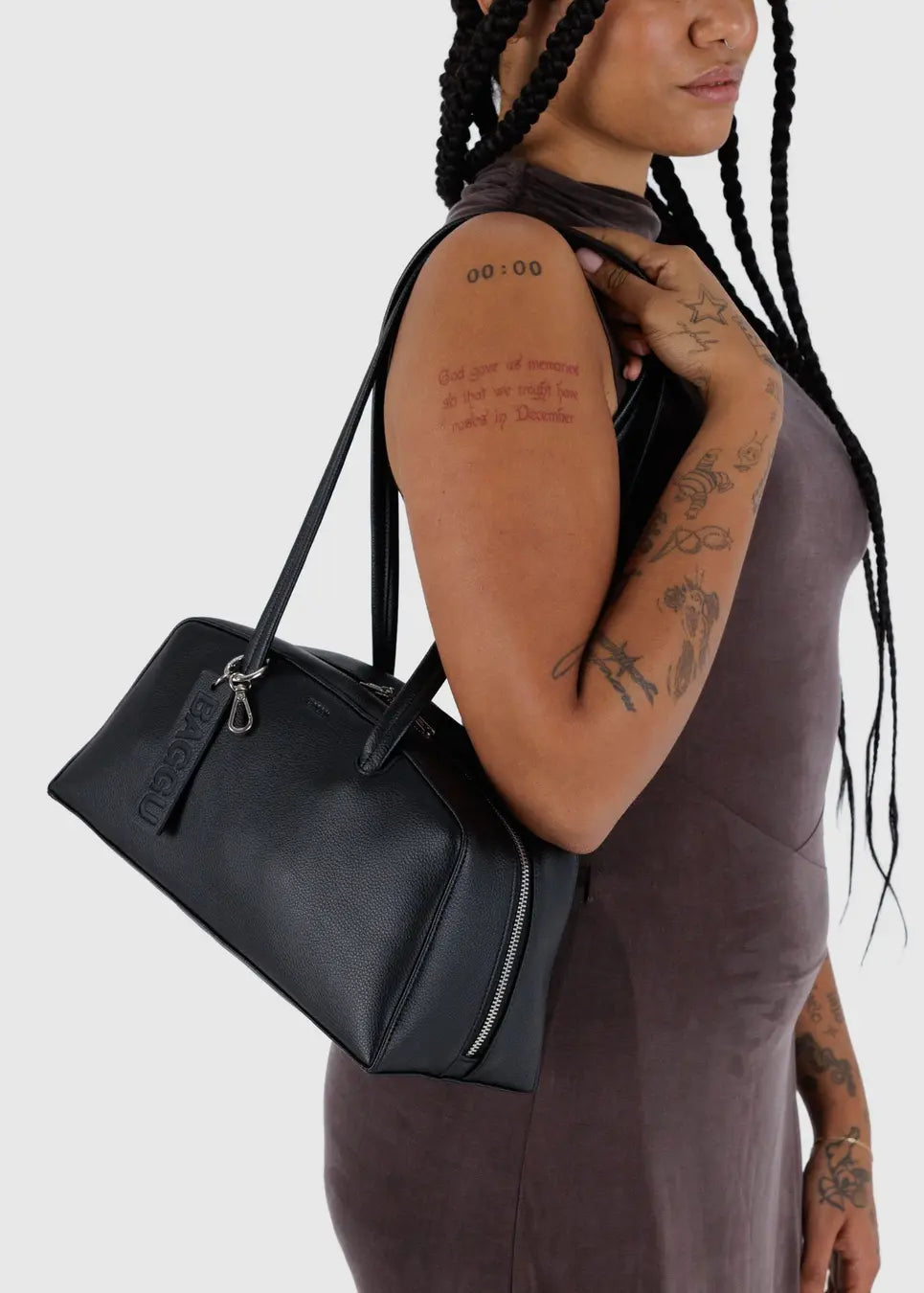 A recycled leather bowler bag designed to be accessorized, with four charm loops and a clip ring. An interior zip pocket keeps things secure and in reach. Extra room fits your book, phone, wallet, keys, and more.