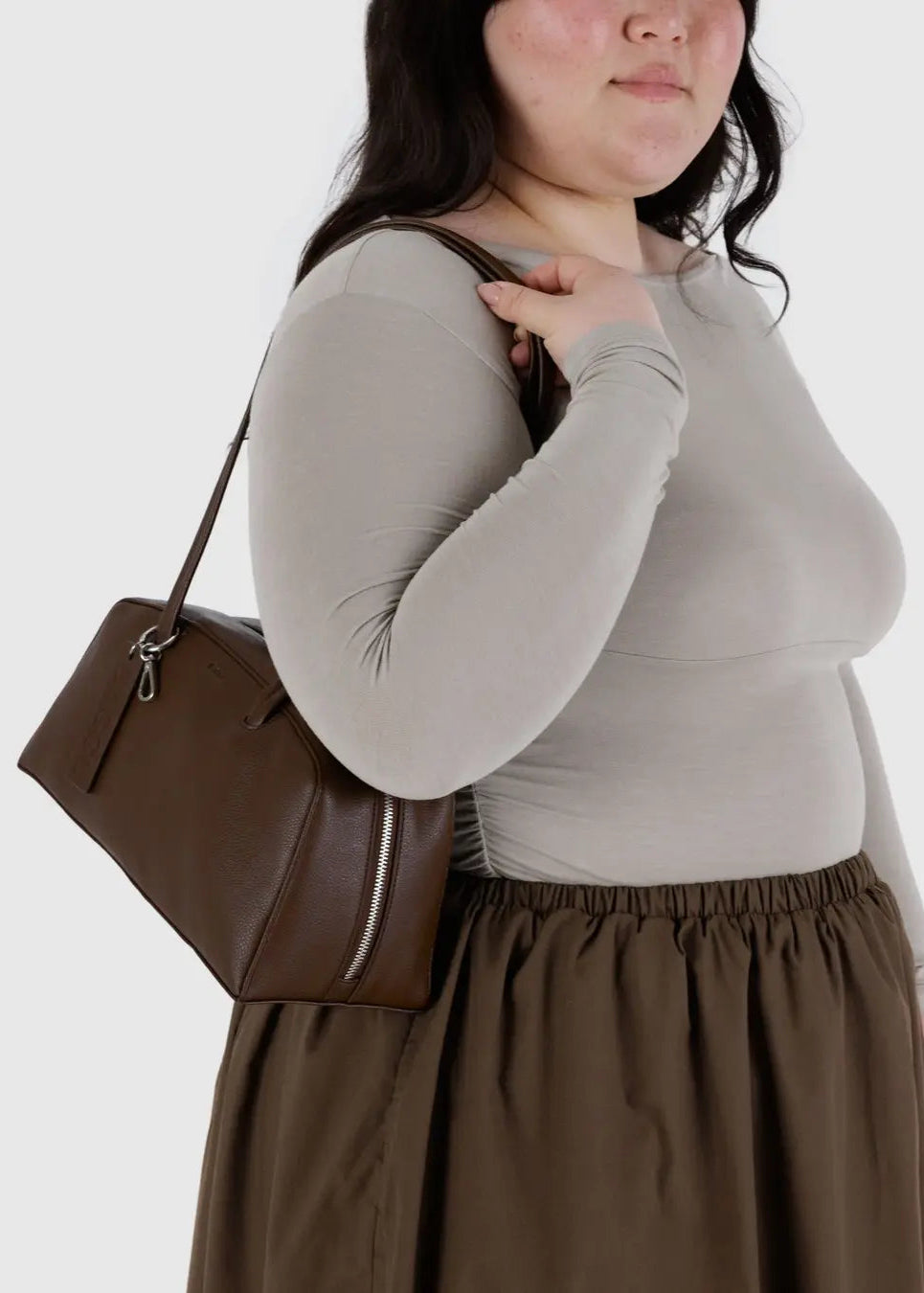 A recycled leather bowler bag designed to be accessorized, with four charm loops and a clip ring. An interior zip pocket keeps things secure and in reach. Extra room fits your book, phone, wallet, keys, and more.