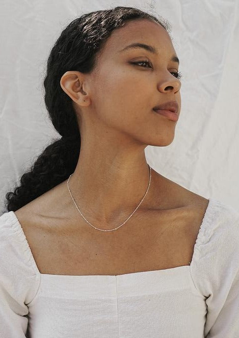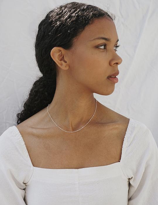 A delicate looking, lace-like necklace that looks great layered up or all on its own.