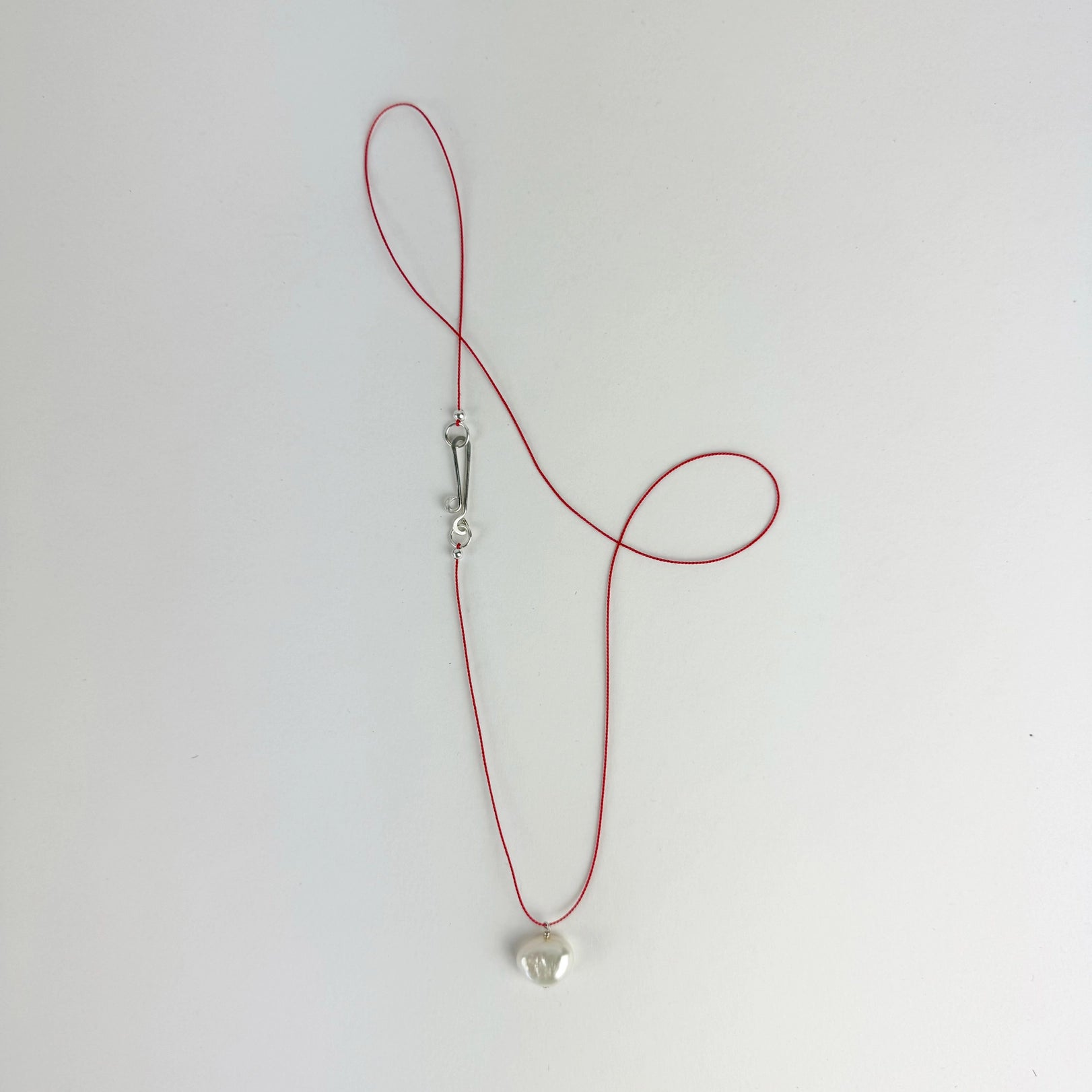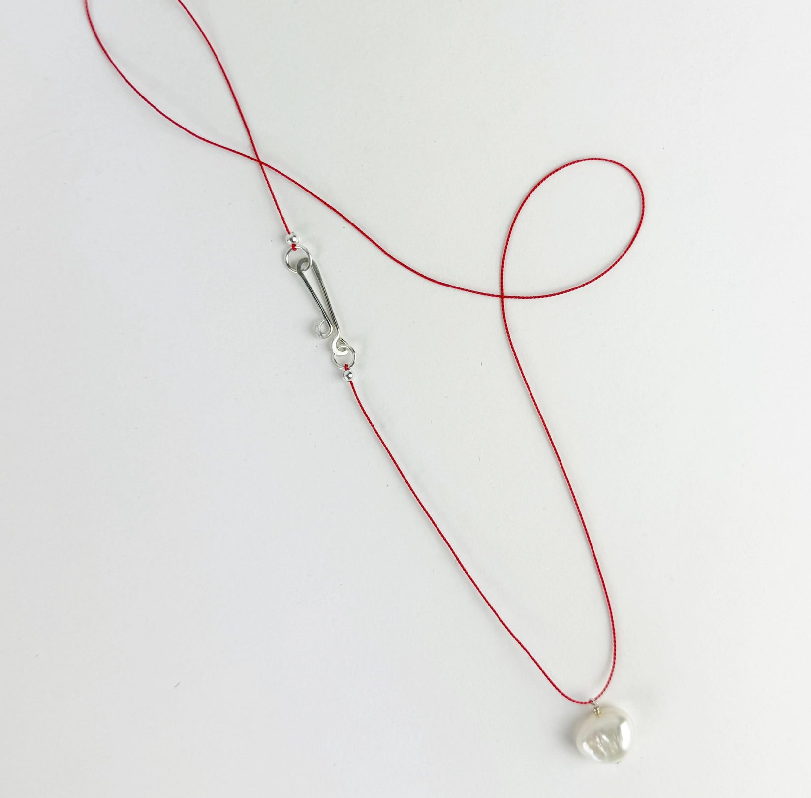 Red is the color of the Hindu Goddess Durga. She represents feminine power, vanquished evils and new beginnings. Freshwater coin Pearl on Silk thread. Choice of Sterling Silver or 14k Gold-Fill metal. Complete with hand forged hook and eye. Made to be layered.