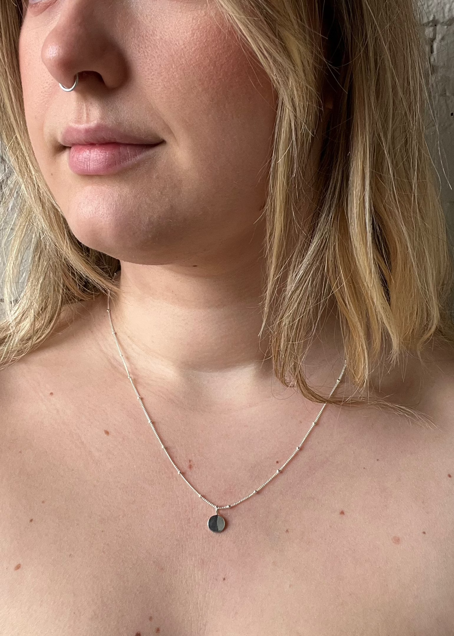 Ellis necklace features a hand carved round pendant in Vermeil hanging from a 20" Satellite Chain made of 14K Gold Filled. A minimal necklace that is easily worn and makes for an ideal layering piece.