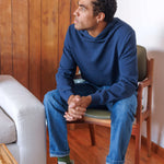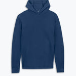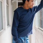 The Caza Hoodie Sweatshirt features a rich, indigo hue made from high-quality slub cotton. It is crafted with 100% organic cotton and colored using natural dyes, while being washed with biodegradable softeners for a more eco-friendly product.