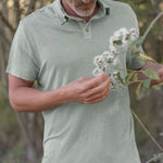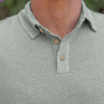 A knit short sleeve polo made with sustainably-grown French linen, coconut buttons, and washed with biodegradable softeners.