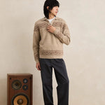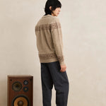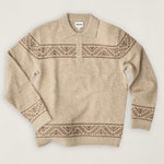 A collared natural knit sweater with button closure, finished with custom jacquard artwork woven across the placket and hem for subtle texture and depth.