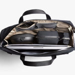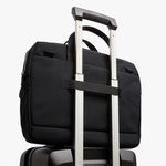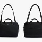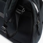 This black Via Work Bag features a padded 16” laptop sleeve with an ultra-wide zip opening for easy access. The main compartment is surprisingly spacious and includes a raised internal mesh zip pocket. An external quick-access pocket with key clip allows for convenient organization. The bag also has a detachable padded shoulder strap, soft rolled-edge webbing handles, and a water-resistant main zipper. A luggage pass-through slides over a suitcase handle for added convenience. Plus, this bag is made from recycled ripstop material and does not contain any leather components.