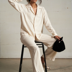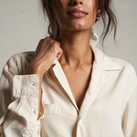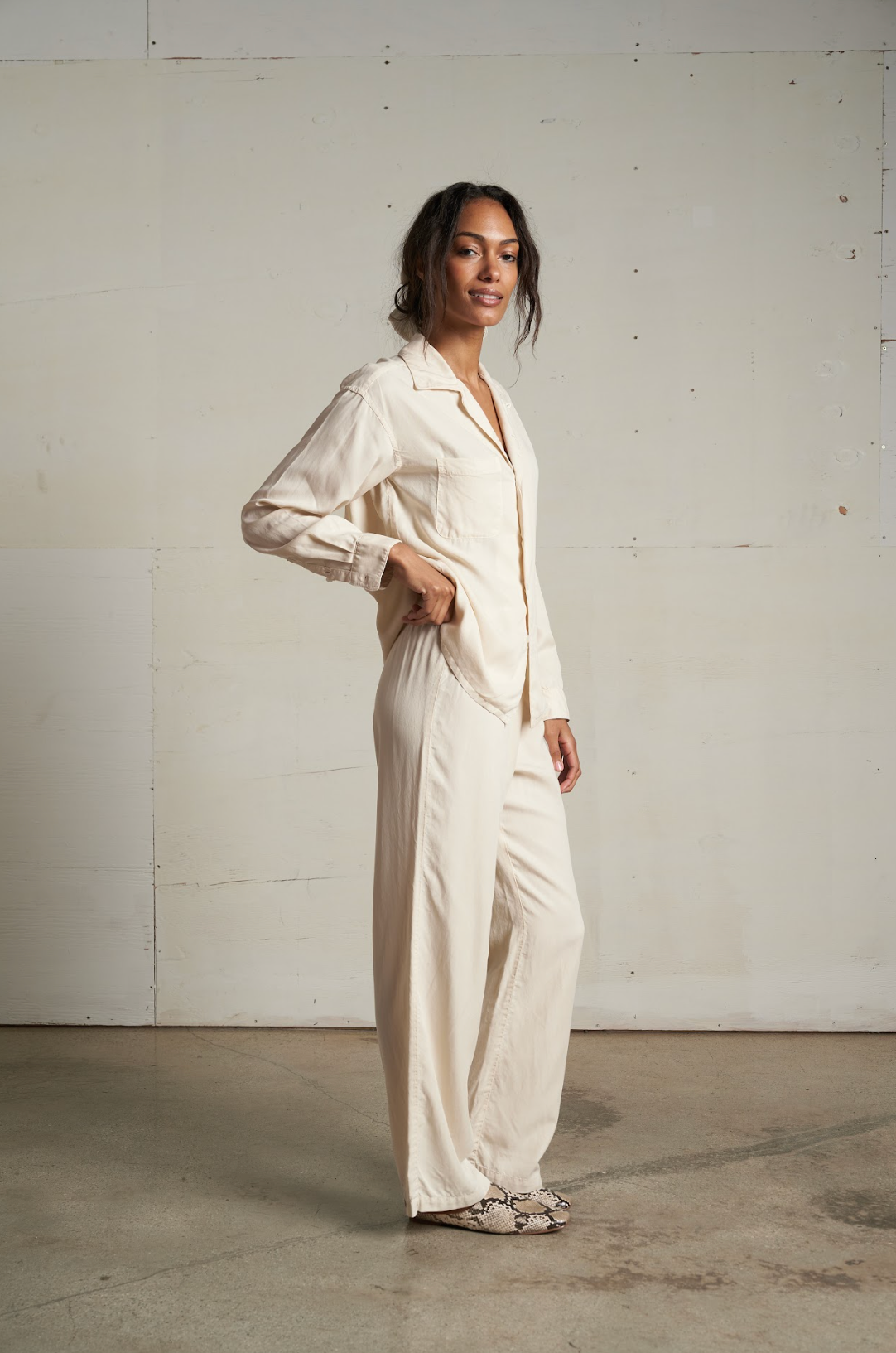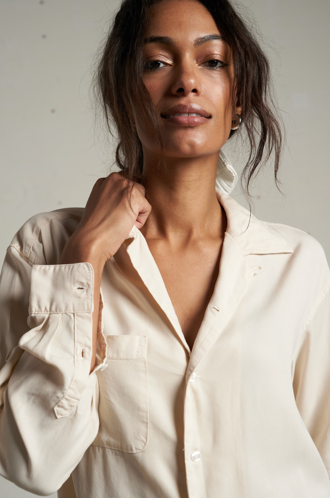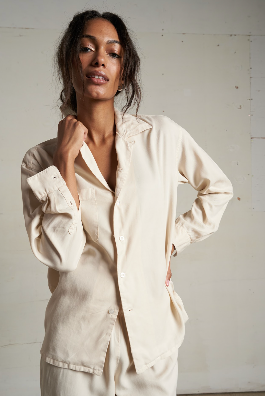 The melody top is crafted in soft, drapey tencel and reimagines the pajama shirt as an everyday piece. designed with a camp collar, full front buttons, and buttoned sleeves that can be worn rolled or long, it balances relaxed ease with a polished finish.