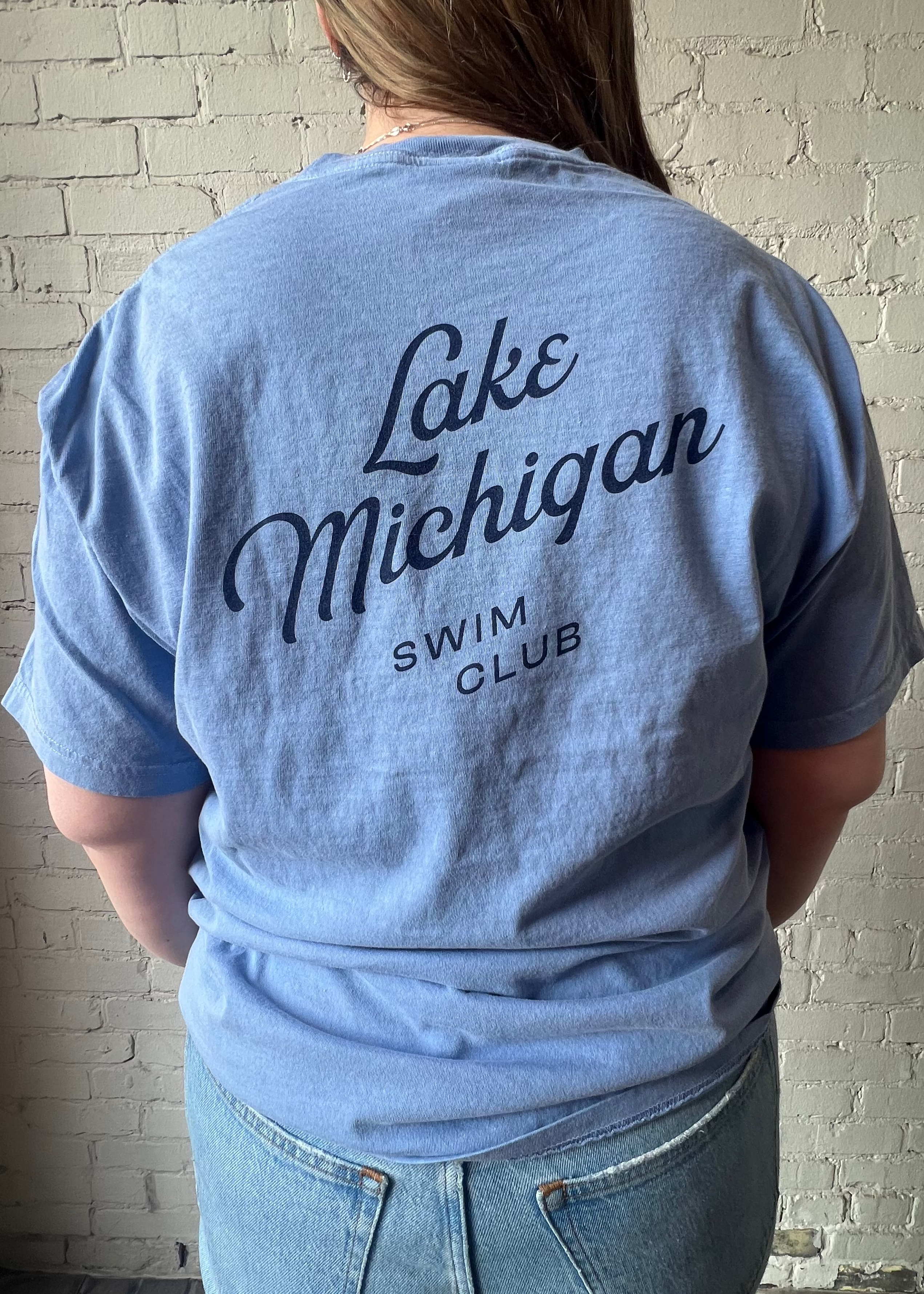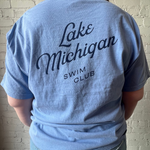 - ”Swim Club” is in navy text on a solid blue t-shirt