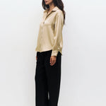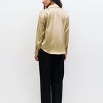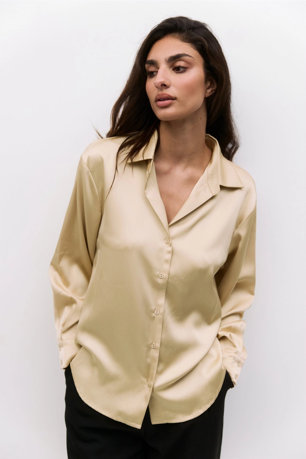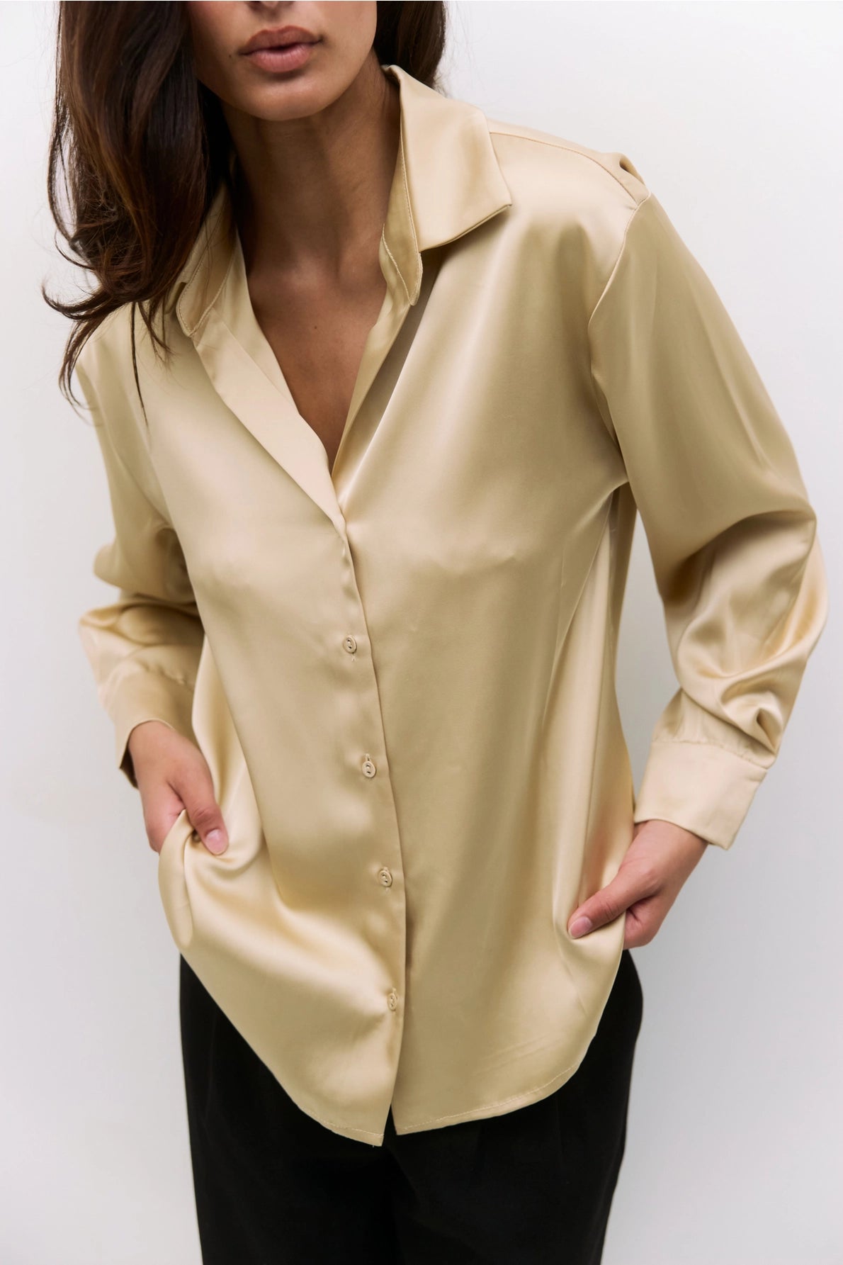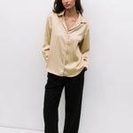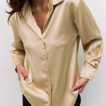 The Irina Top is a long-sleeve satin blouse featuring a classic collared V neckline and full front button closure for a refined silhouette. The cuffs are finished with a partial button closure, adding a subtle touch of structure to its sleek, fluid drape.
