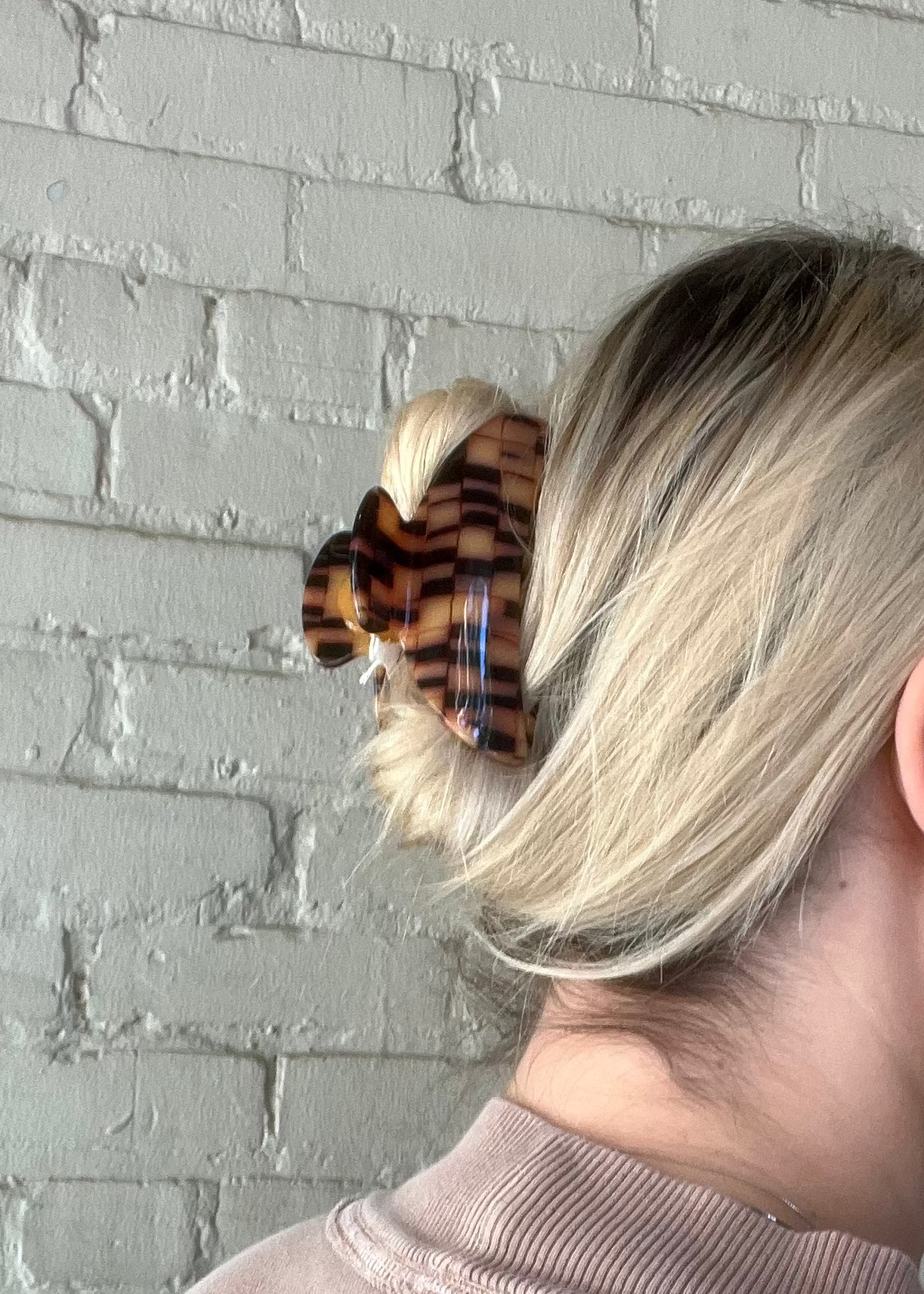 A double-walled hair claw designed to hold medium volumes of hair, handcrafted from Italian acetate with reinforced hardware. Recommended for all hair types and textures.