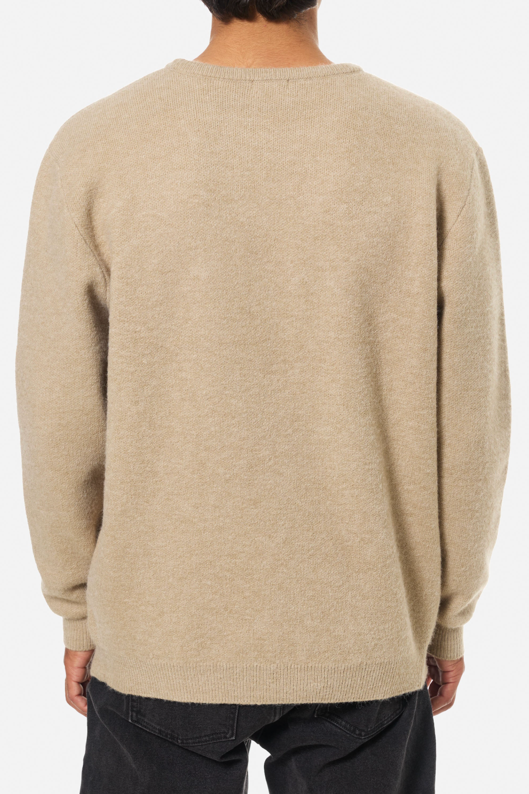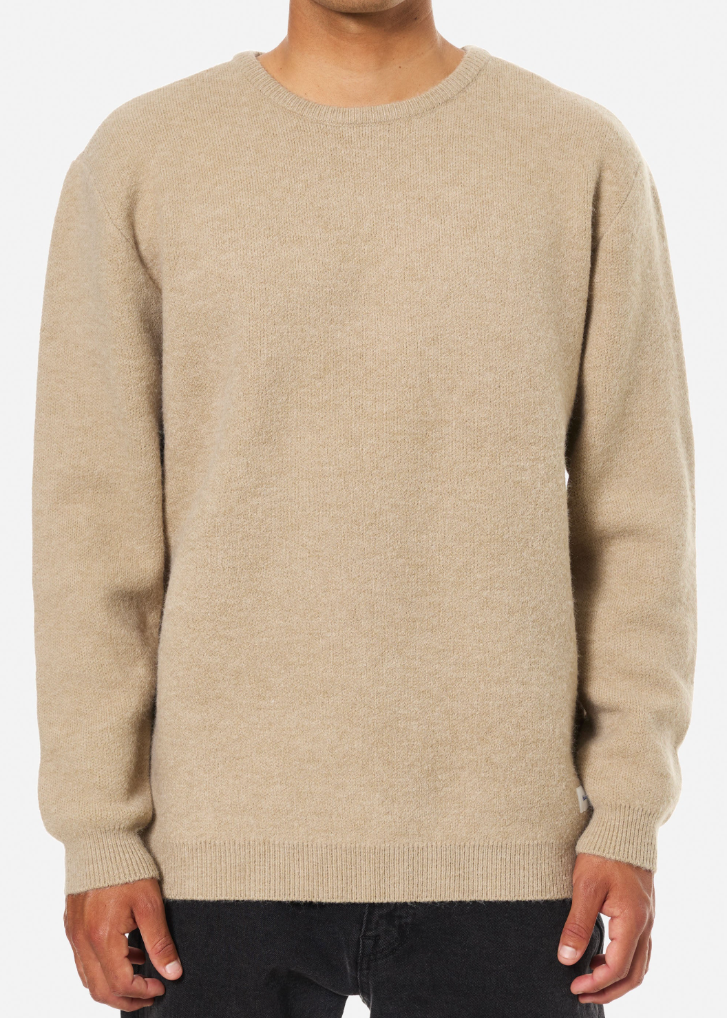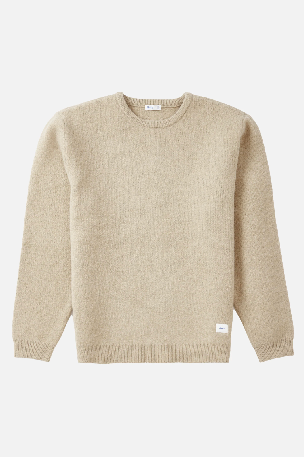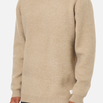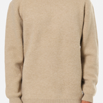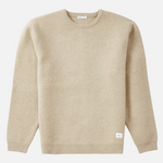 The Rivers Sweater features ultra-soft blended yarn in a light khaki color.