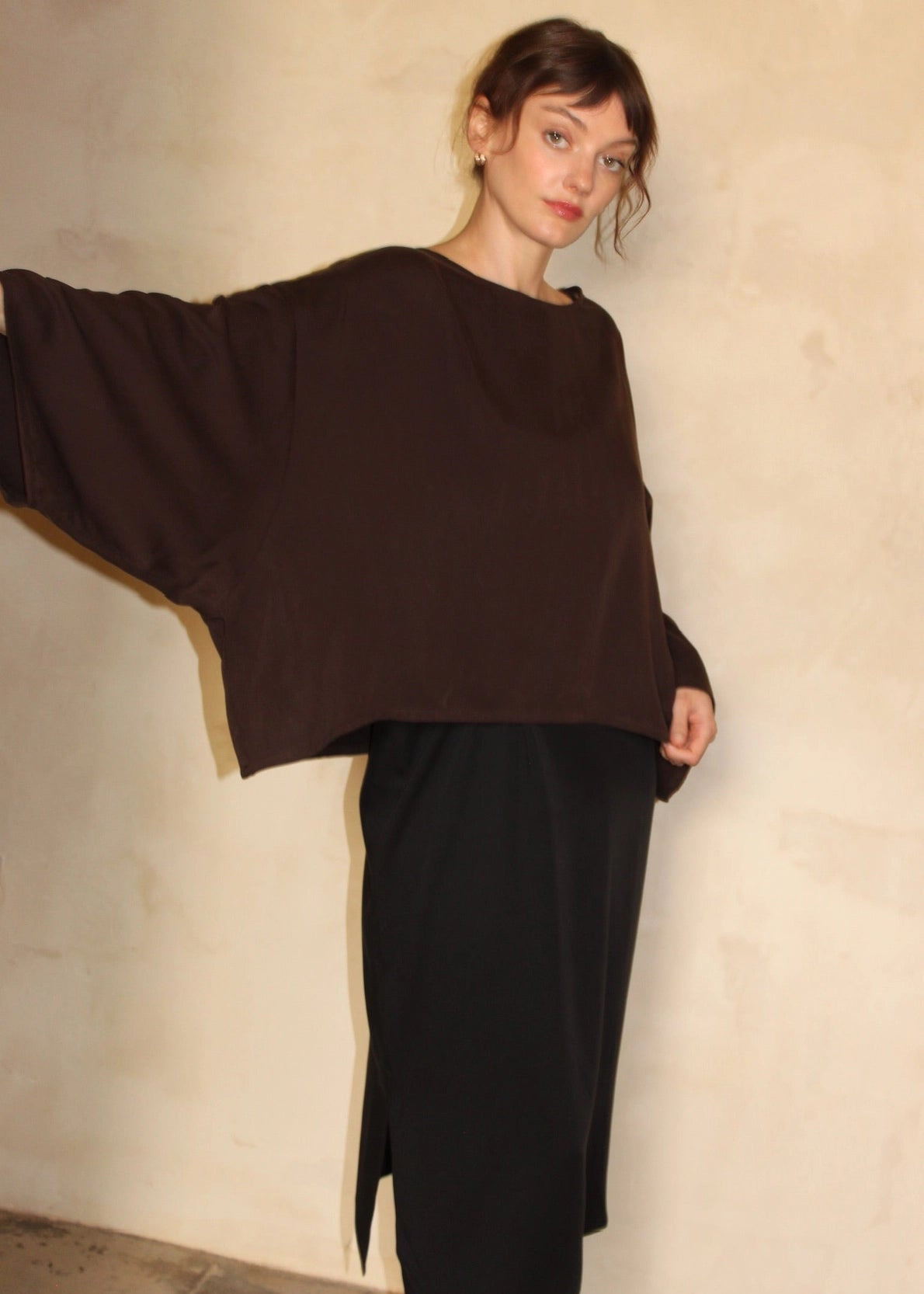 The Robyn Tencel Top is a highly versatile and luxurious blouse, perfect for styling in numerous ways. It boasts a graceful scooped neckline, dropped shoulders, and effortlessly elegant drape. Made from high-quality tencel material, the top provides a cool and substantial feel.