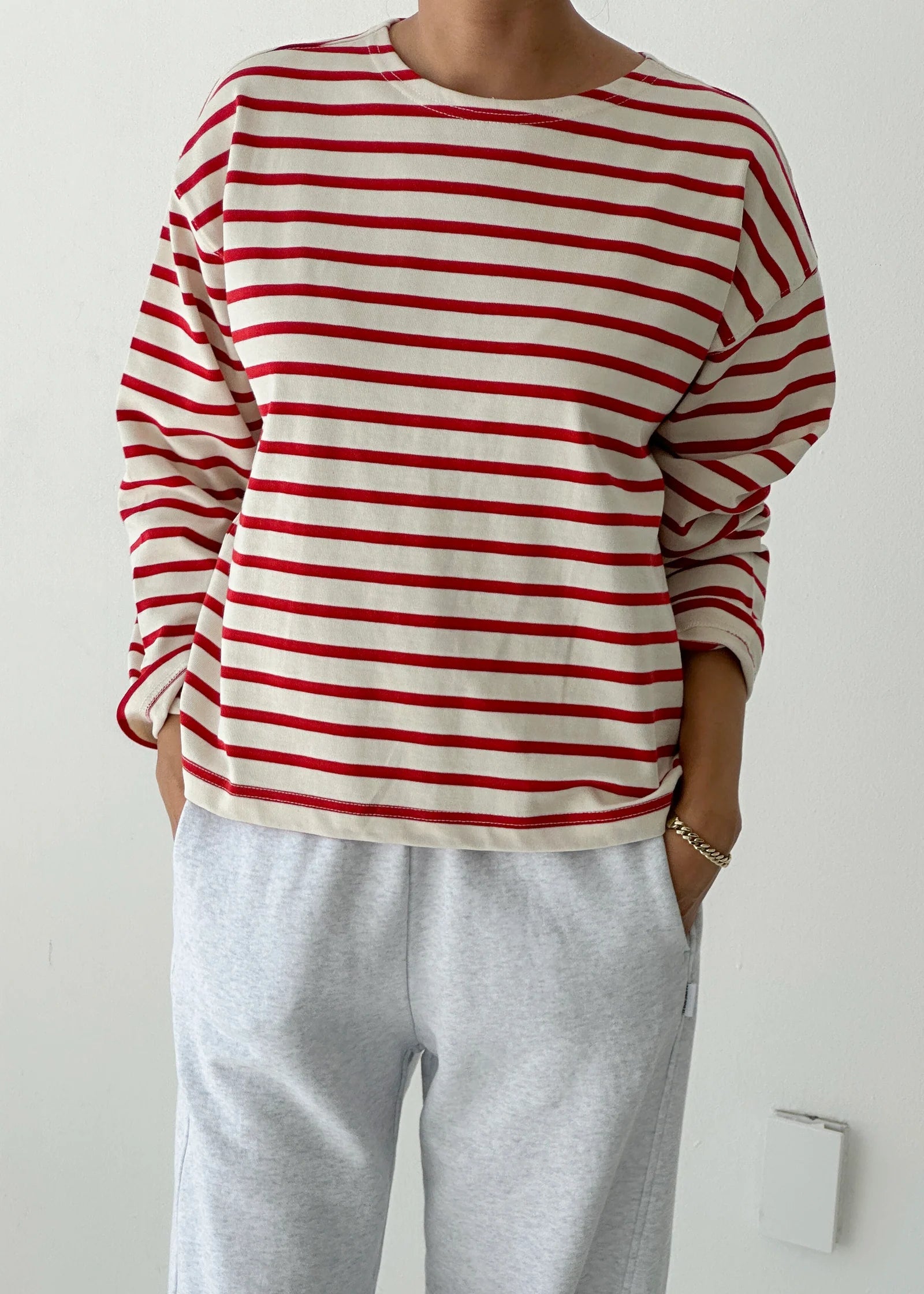 A nautical long sleeve with a classic fit. Stripe and boxy shape, but updated with a flattering round neckline and a slightly cropped length that pairs effortlessly with high-waisted bottoms.