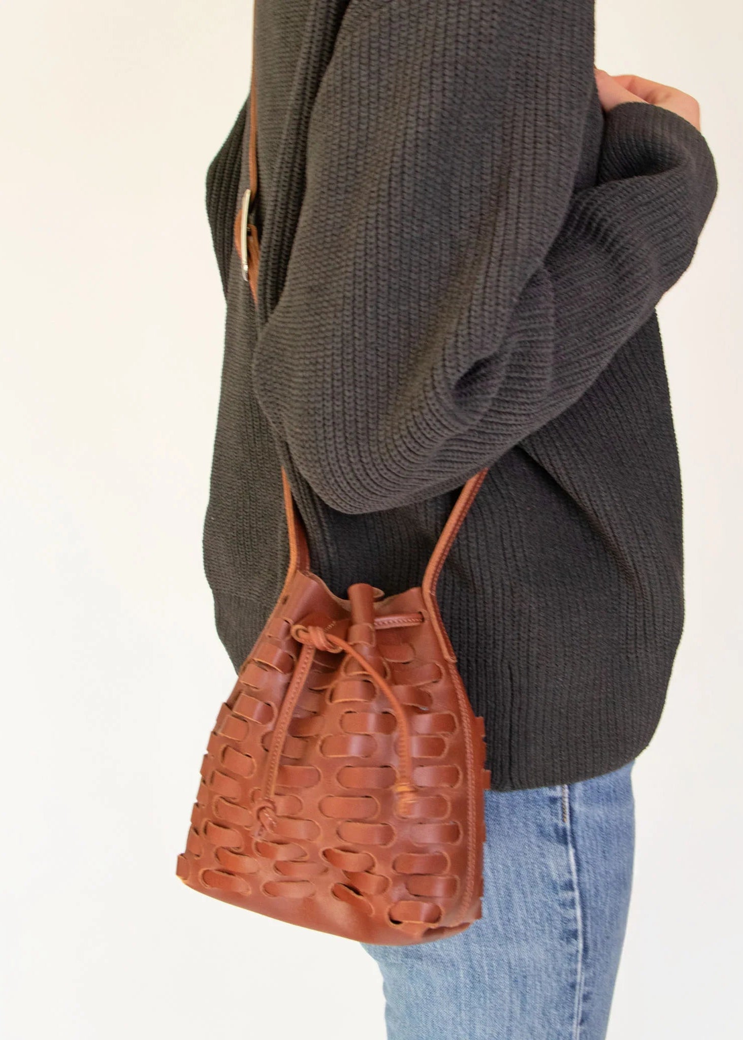 Crafted from smooth, vegetable-tanned natural leather, this small woven bucket bag features a leather strap closure.